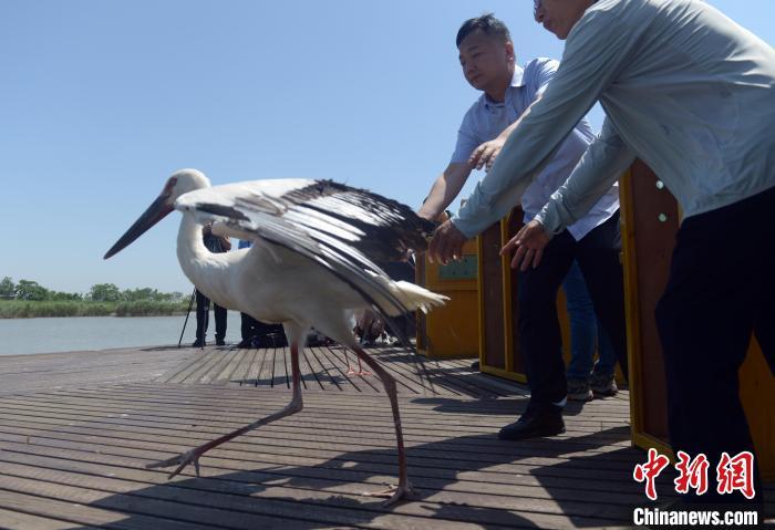 7月5日,在江苏盐城湿地珍禽国家级自然保护区,四只东方白鹳戴着动物北斗定位“小脚环”缓缓走向湖边,飞向天空。