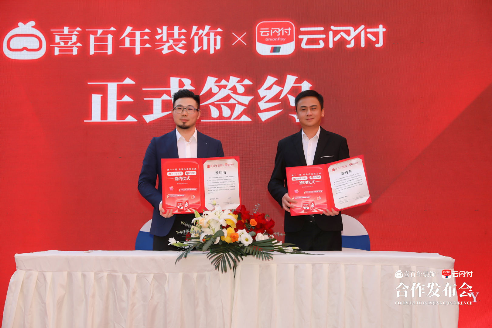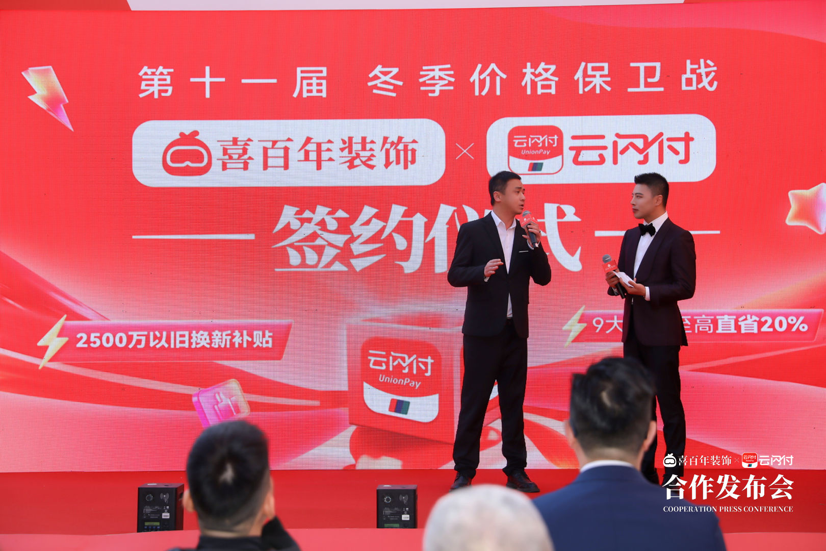 11月29日,第十一届冬季价格保卫战 喜百年×云闪付签约仪式于下午3点在喜百年超级家居MALL举行,喜百年装饰集团董事长黄小飞,喜百年装饰集团工程总监童乾坤,喜百年装饰集团工程副总监梁润忠,喜百年装饰贵阳总经理刘建兰,云闪付代表,喜百年好装修推荐官柳叶眉出席签约仪式,见证双方合作的正式启动。