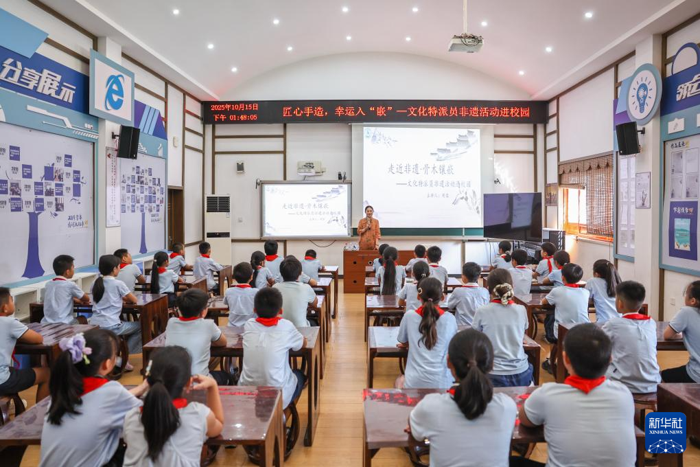 胡蓉在宁波市怡江小学为学生讲解非遗体验课程。新华社记者 江汉 摄