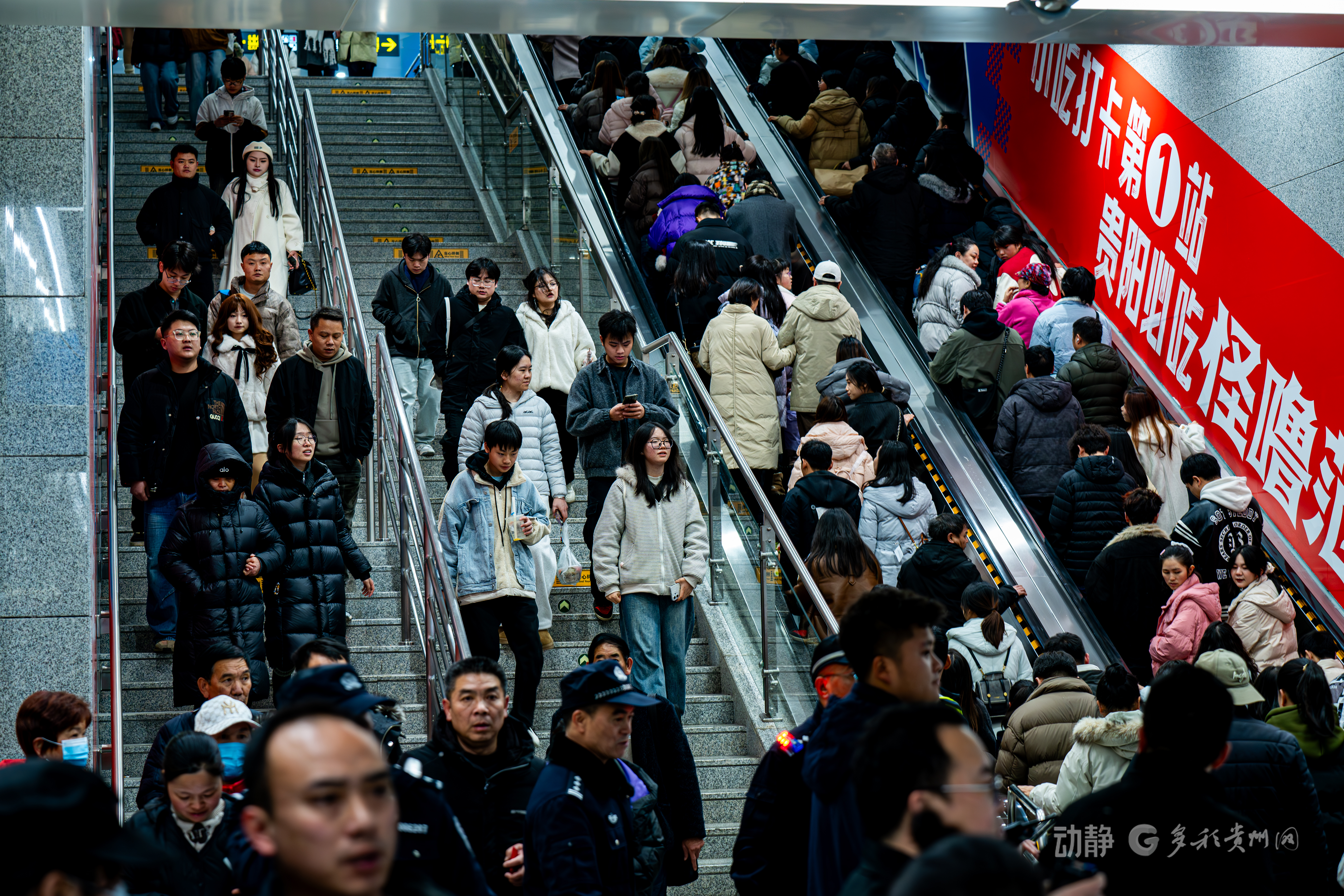春节将至,年味渐浓。2月12日,春运第十天。中国中铁贵阳轨道交通三号线内乘客人人潮涌动,步履匆匆,身着制服的站务员在关键通道处值守,站内广播不断提醒乘客注意脚下安全。
