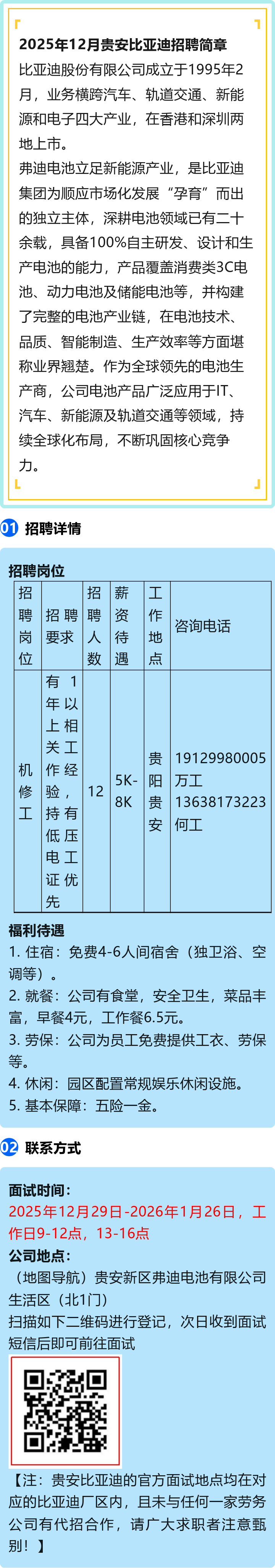 【知名企业】贵安比亚迪招聘!月薪5000~8000元!五险一金!免费宿舍!