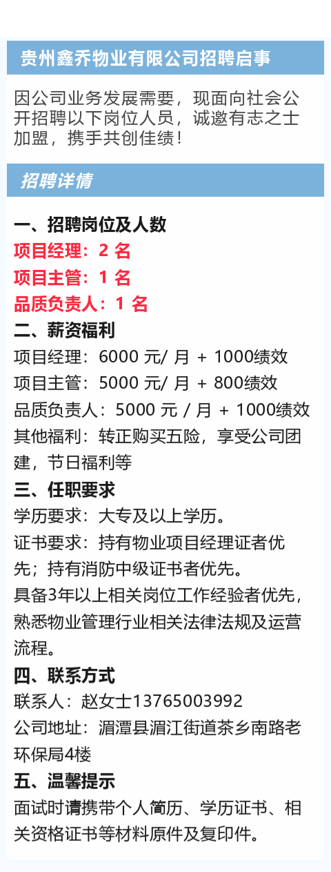 贵州鑫乔物业有限公司3岗招聘!月薪5000-6000元+!
