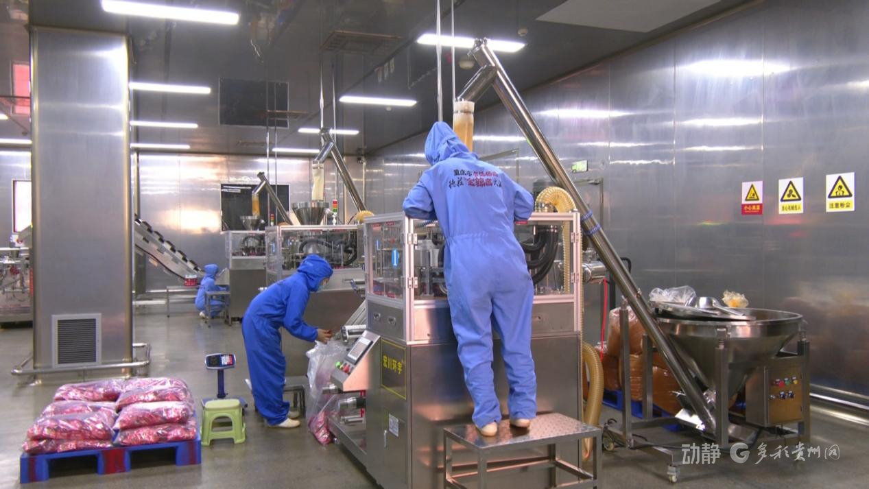 遵义德庄食品产业有限责任公司生产主管张羽说:“员工直接上料以后,通过设备的参数以及一些传送带,就直接可以做成产品,现在辣椒面车间每日产量是在1吨左右。”