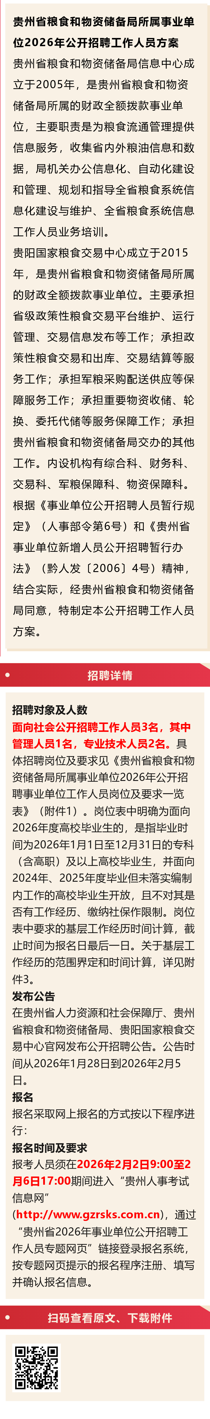 贵州省粮食和物资储备局所属事业单位招聘!报名时间:2026年2月2日~2月6日!