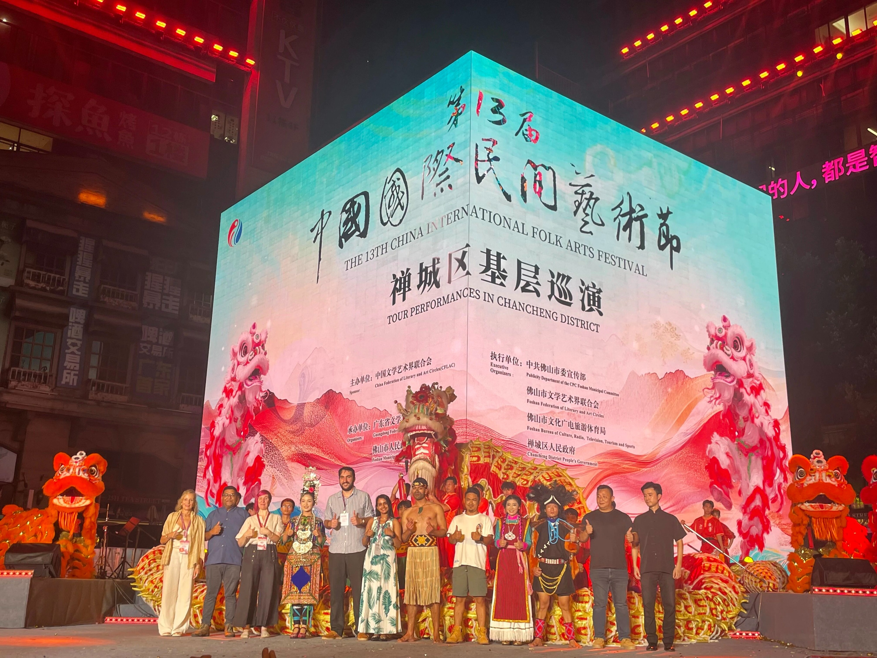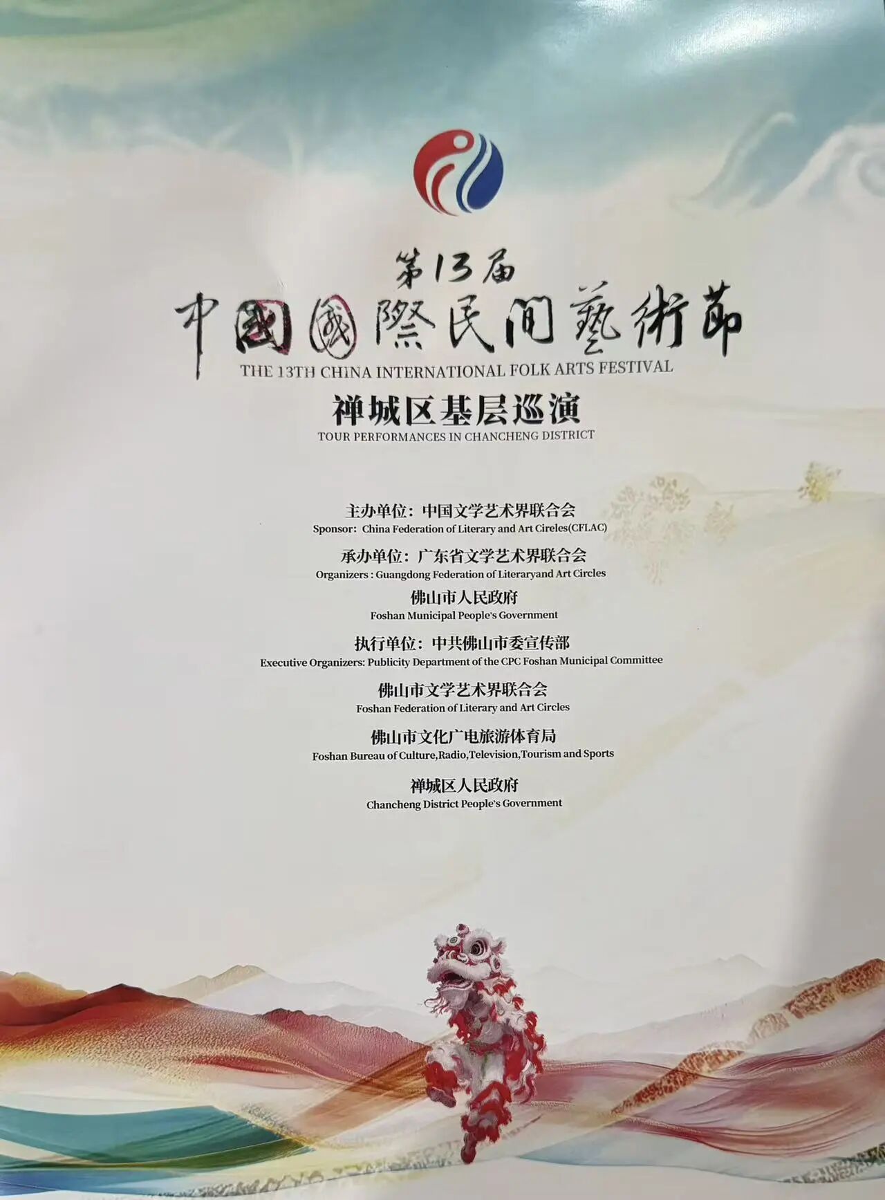 2025年10月18日晚,以“跨越山海 共向未来”为主题的第十三届中国国际民间艺术节基层巡演在佛山创意产业园泡泡广场拉开序幕。本次活动由中国文学艺术界联合会主办,广东省文学艺术界联合会、佛山市人民政府承办,中共佛山市委宣传部、佛山市文学艺术界联合会、佛山市文化广电旅游体育局、禅城区人民政府共同执行。