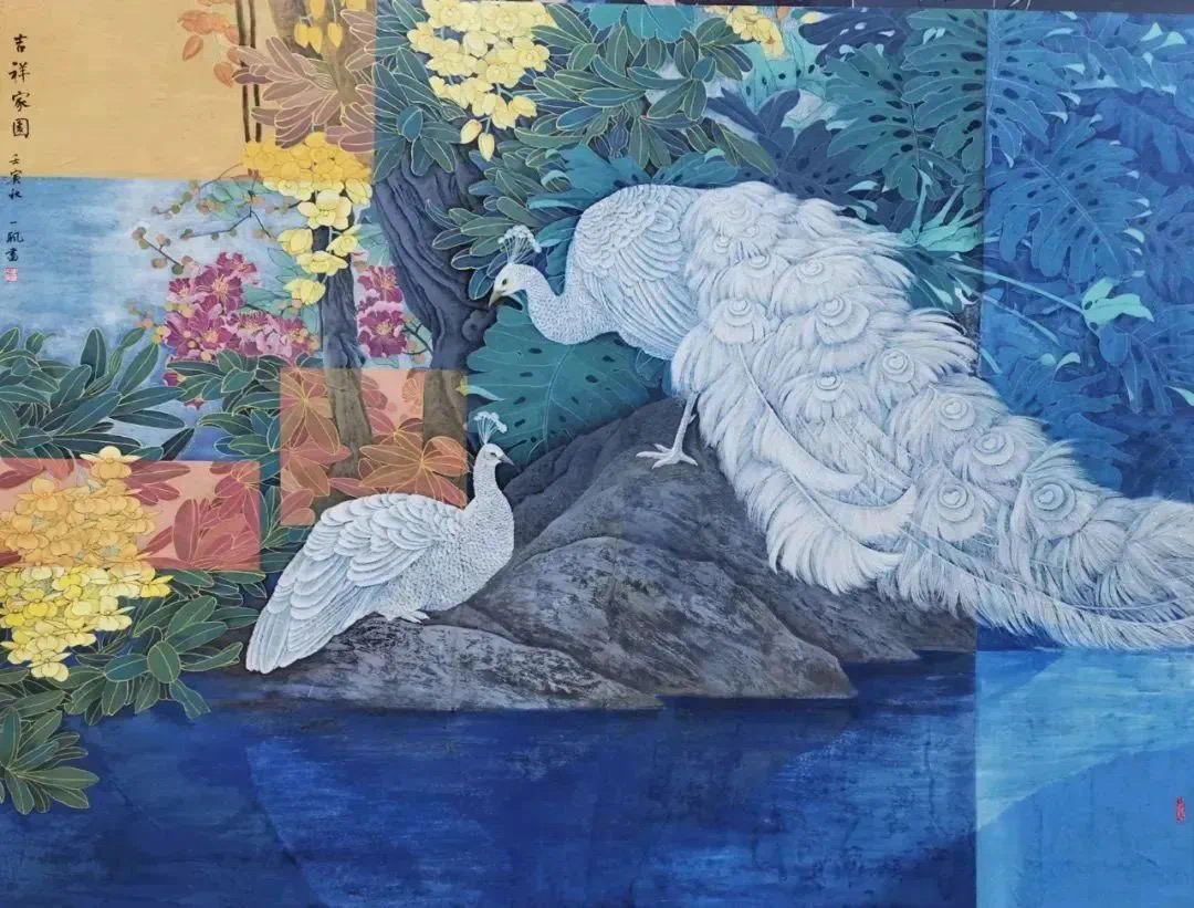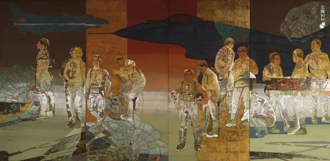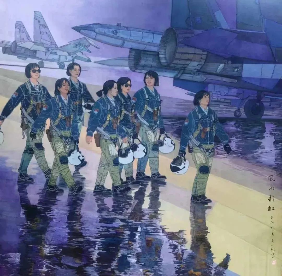王一帆的创作以工笔重彩见长,尤擅军旅题材。她的画风严谨细腻,色彩沉稳庄重,常以军人、救援、航天航空等场景入画,展现史诗般壮丽的视觉效果,呈现出革命乐观的主题精神与时代风尚,既融合军旅生活的雄浑气魄,又兼具艺术创作的梦幻创意,充满家国情怀与感染力。其扇面画作《竹报平安》于今年三月参与厦航艺术客舱《清风三月 妙笔春华》云端展览。