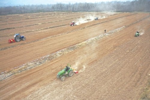 早春时节,青海省民和县官亭镇的广袤田野上,多台播种机在田垄间穿梭作业,一派繁忙的春耕景象。 民和县委宣传部提供