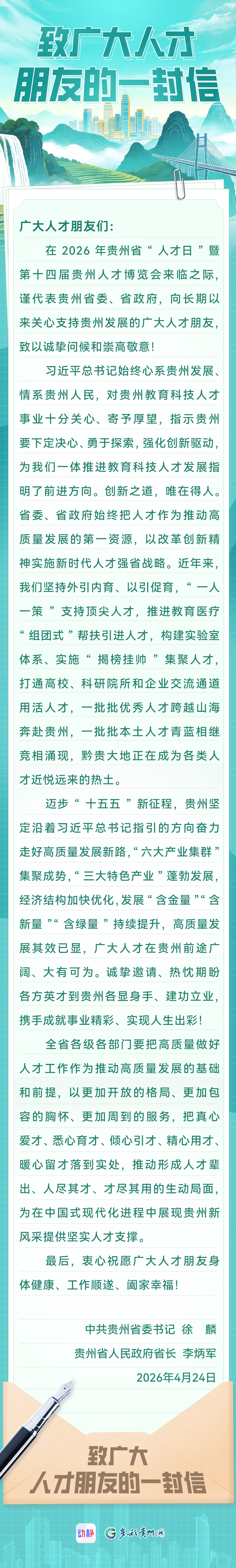 贵州省委书记、省长致广大人才朋友的一封信