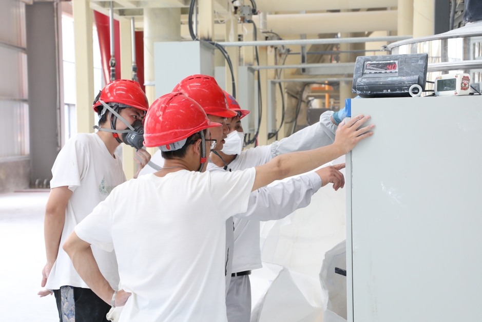 在公司中控室工作一年多的梁安碧,正目不转睛地盯着解聚工序生产线各项参数,通过查看数据实时了解纳米碳酸钙的解聚情况。进入公司后,梁安碧经过岗前培训,学习掌握各项操作流程,成功转型技术工人,不仅待遇好,工作环境也不错。