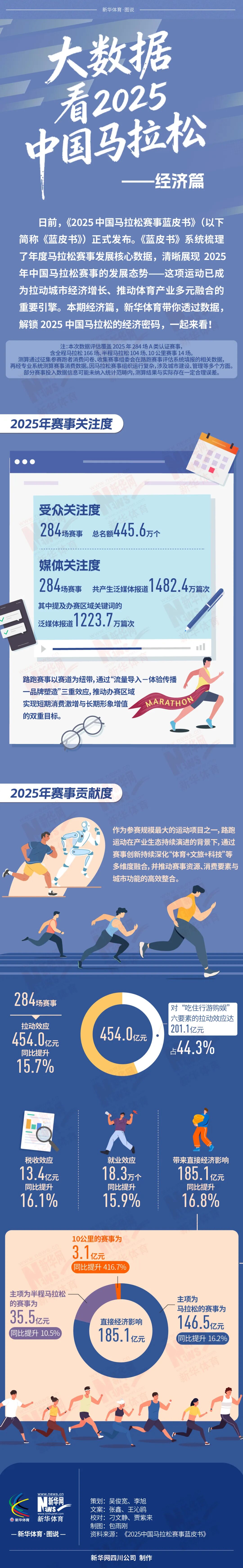 日前,《2025中国马拉松赛事蓝皮书》(以下简称《蓝皮书》)正式发布。《蓝皮书》系统梳理了年度马拉松赛事发展核心数据,清晰展现2025年中国马拉松赛事的发展态势——这项运动已成为拉动城市经济增长、推动体育产业多元融合的重要引擎。本期经济篇,新华体育带你透过数据,解锁2025中国马拉松的经济密码,一起来看!