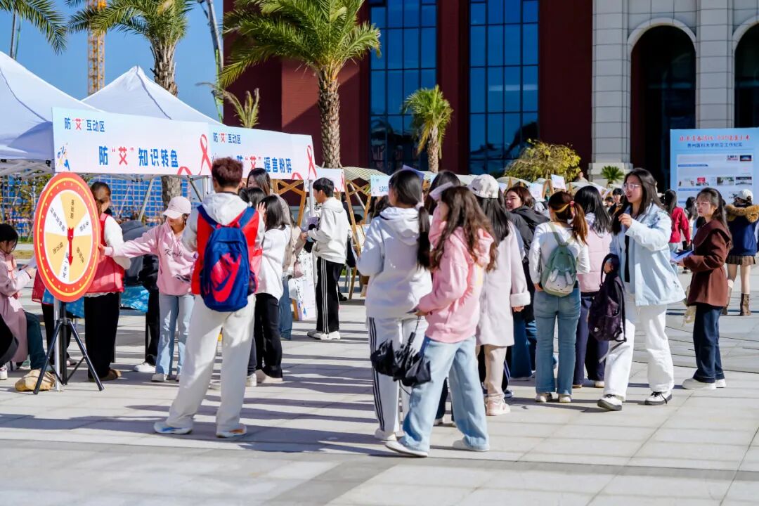 活动坚持守正创新,在场外同步开设防艾科普“青春市集”,推出多项互动体验项目,让科学防治知识更可感可及。学校青年志愿者联合会、校艾滋病青春同伴教育协会在礼堂外设置了知“艾”实验区、普“艾”宣传区、伴“艾”游戏区、护“艾”志愿区和传“艾”文创区等多个互动板块,通过海报展播、知识宣传、合影打卡、问答游戏、倡议签名等形式,向广大青年学生普及艾滋病防治知识。