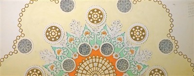 受敦煌藻井图案启发,常沙娜在天顶中央设计了一朵唐风圆形浮雕大花。“只设计花瓣不行,得把通风口及照明灯组合在里面。”工程师张镈点醒了她。经过连夜修改,最后完成的设计方案,把唐代的花饰图案与通风、照明的功能需求及不同材质的组合统一起来,再用敦煌风格的富丽图案组织。