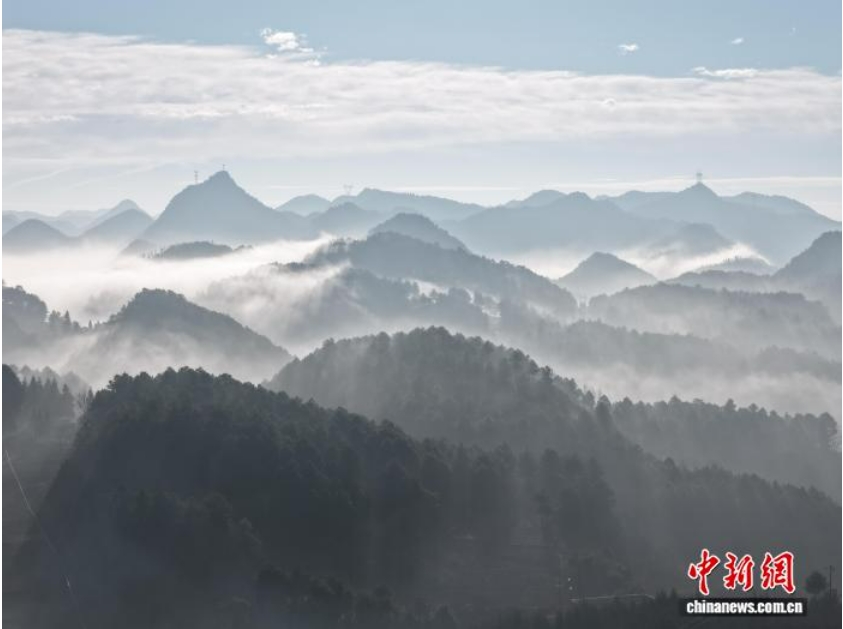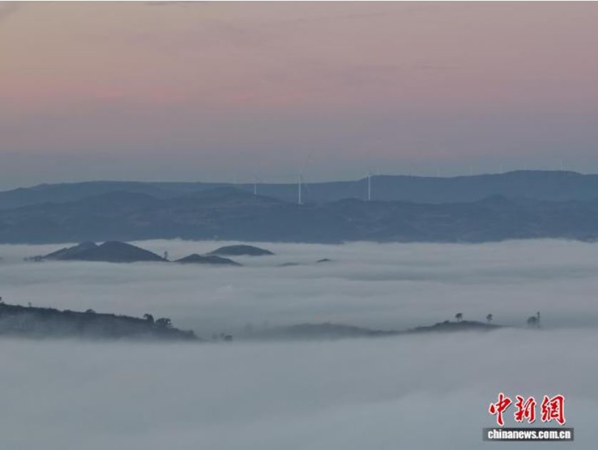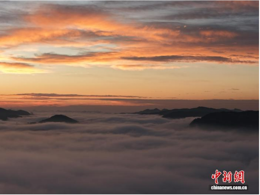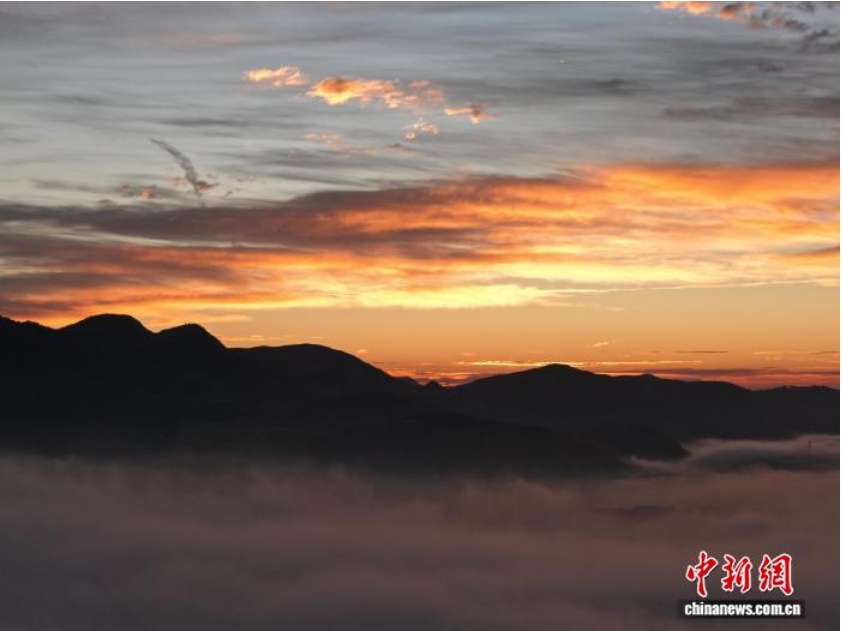 2月5日清晨,贵州省毕节市威宁彝族回族苗族自治县城郊,伴随日出,群山与云海交织形成一幅美丽画卷。