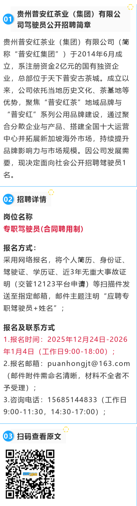 【国企】招聘驾驶员!提供食宿!报名截止时间:2026年1月4日!