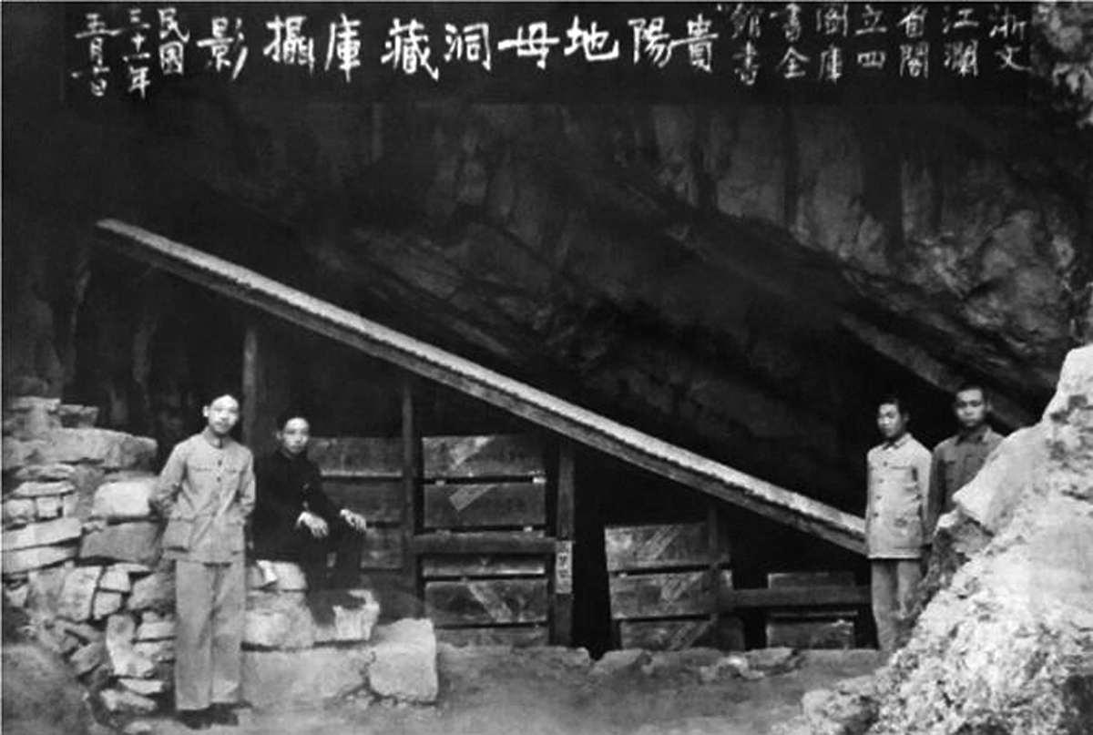 1942年地母洞藏书库留影(左一为毛春翔,图片为毛春翔之子毛念诚提供。图片来源龚玉和著《毛春翔与文澜阁书西迁》,《文化交流》2015年第6期)