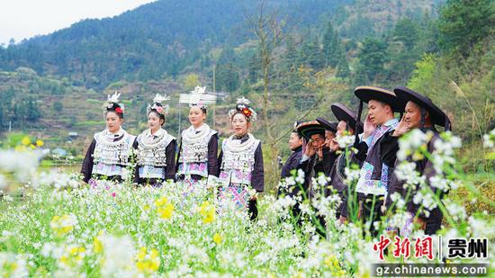 巡游结束后,苗族青年男女移步至寨边田埂,前临金黄油菜花田、背靠叠翠青山,双方分站田埂两侧开启多声部情歌对唱。男声浑厚、女声清亮,高低声部交织,婉转歌声绕着花海漫过青山,游客们驻足聆听,沉醉在苗乡的浪漫风情里。