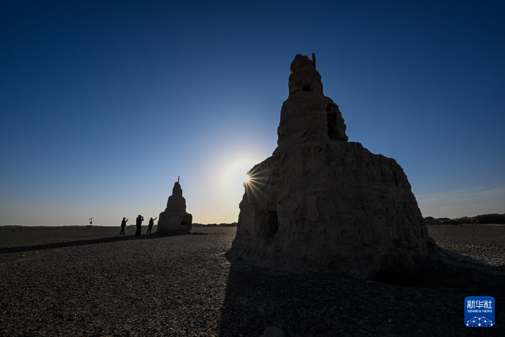 11月3日,额济纳旗文保中心工作人员在居延遗址中的西夏五塔遗址巡护。新华社记者 连振 摄