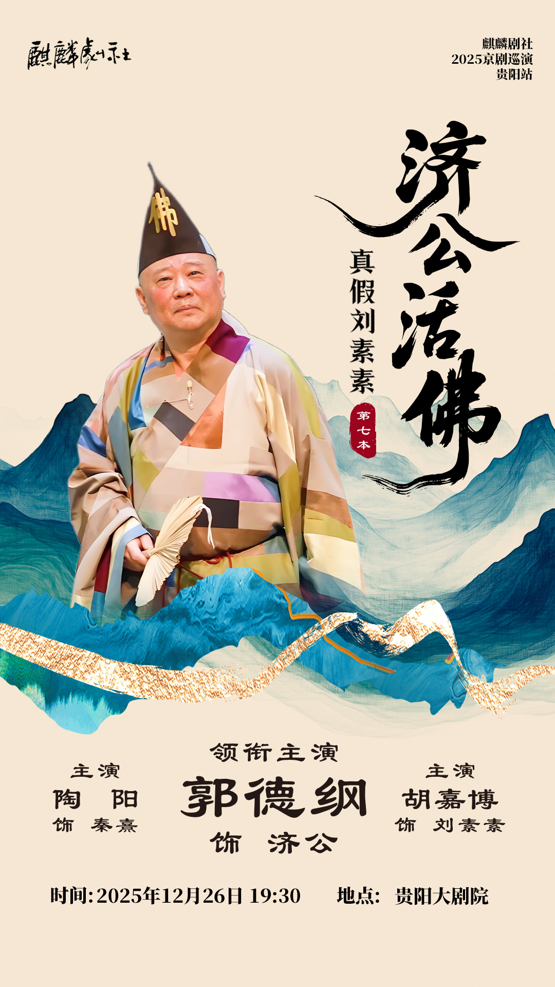 贵阳的朋友们注意啦!12月26日,贵阳大剧院即将迎来一场国粹盛宴!麒麟剧社将在贵阳首演,由郭德纲领衔主演的《济公活佛》第七本。