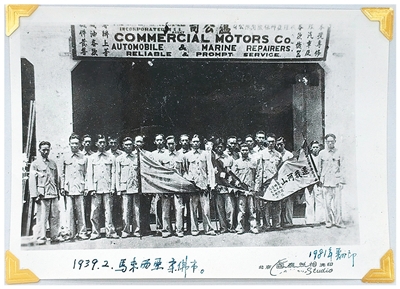 回国前,温祺芳与其他有志南洋华裔青年在汽车修理铺牌匾下合影。中国华侨历史博物馆供图