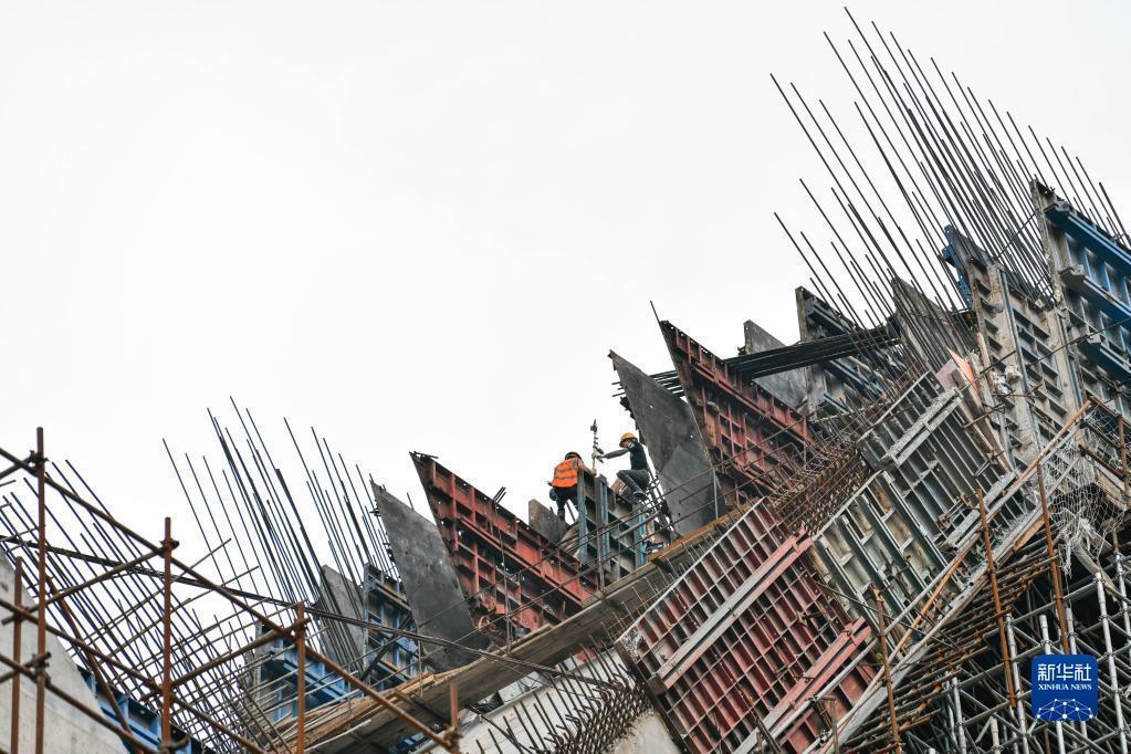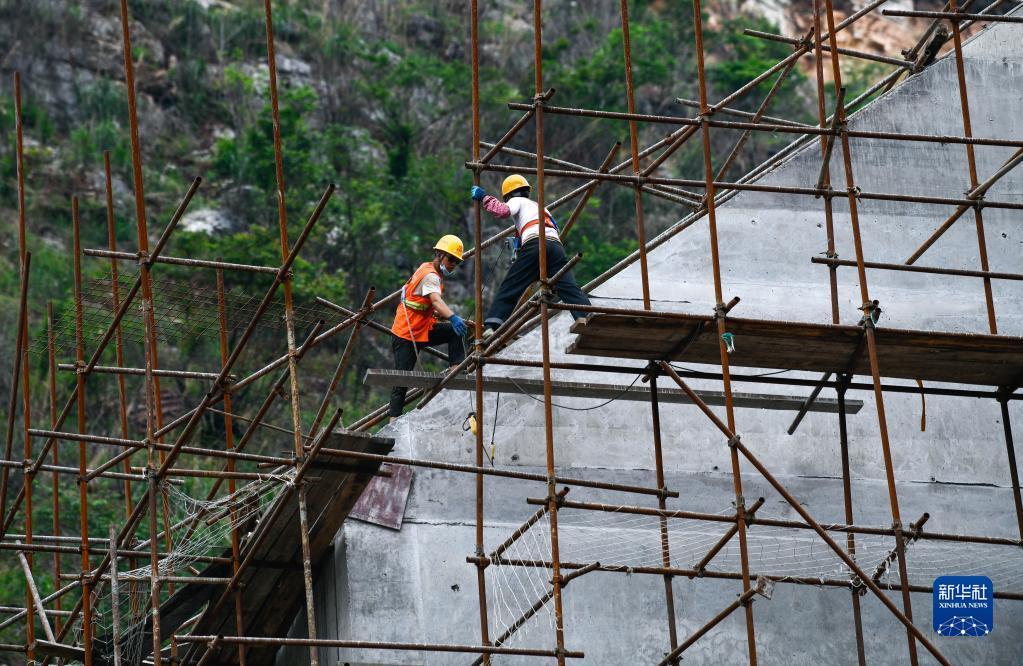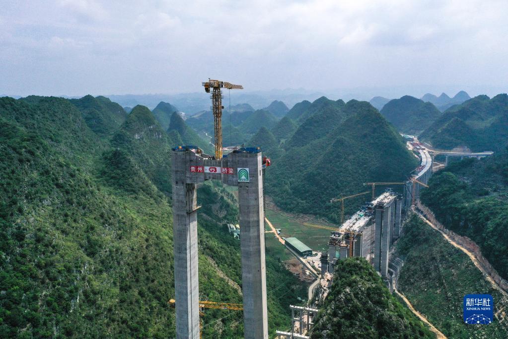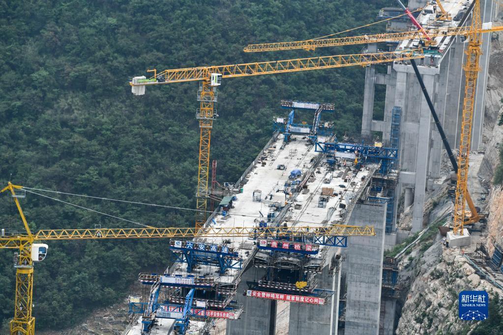 6月14日,工人在贵州花江峡谷大桥引桥上施工。 杨文斌 摄
