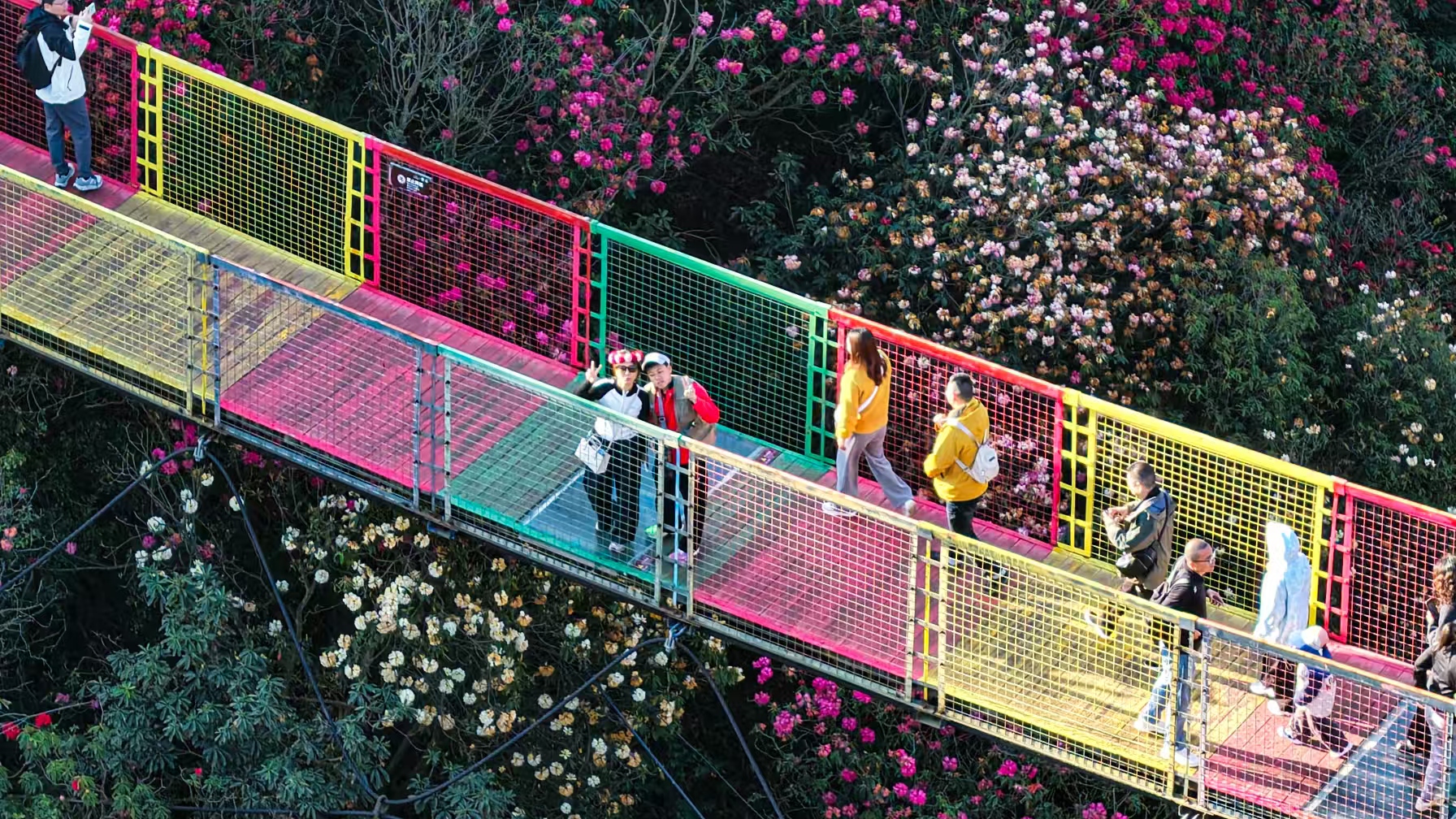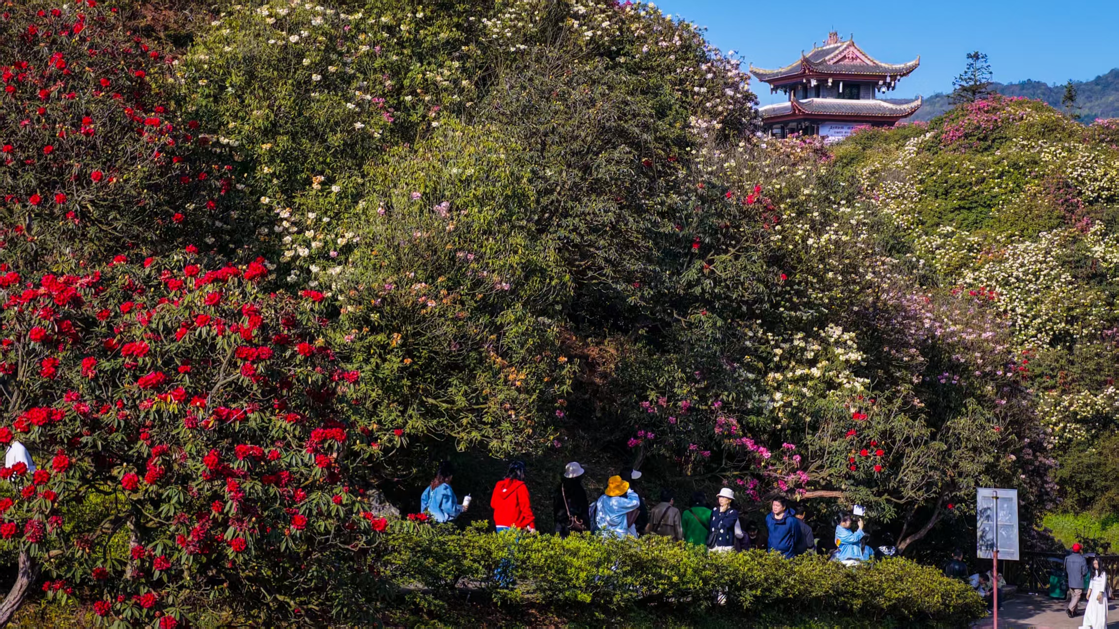 绵延百余平方公里的原始杜鹃林次第盛开,红、粉、白、紫等各色花朵交织成片,漫山披彩、层峦尽染。清风拂过,花浪起伏,暗香浮动,壮阔花海与青山翠岭相映成趣,一步一景、如诗如画,尽显 “地球彩带、世界花园” 的独特魅力,吸引不少游客前来踏青赏花,共赴这场春日盛宴。