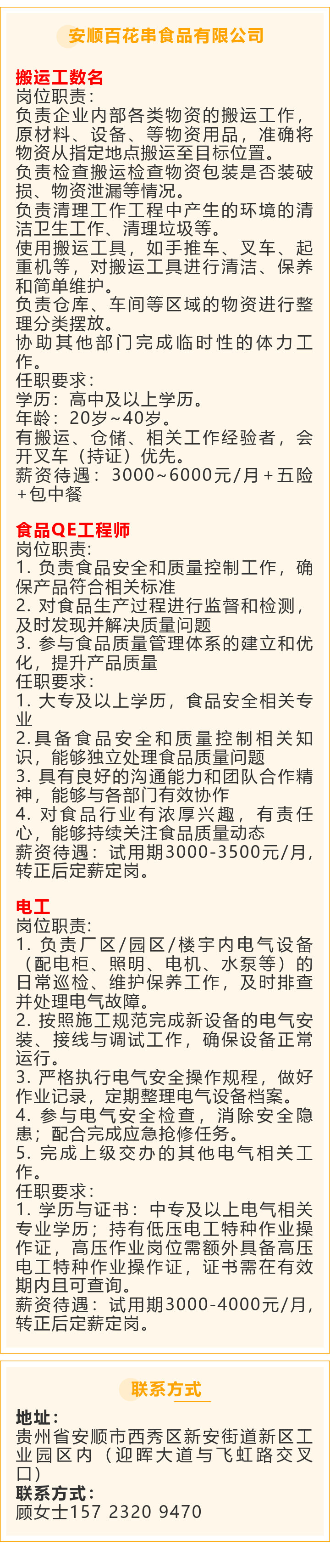 安顺百花串食品有限公司招聘搬运工、食品QE工程师、电工!