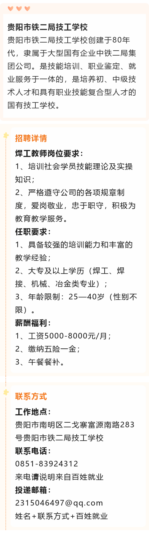【中铁二局】贵阳市铁二局技工学校招聘!月薪5000-8000元!五险一金+餐补!
