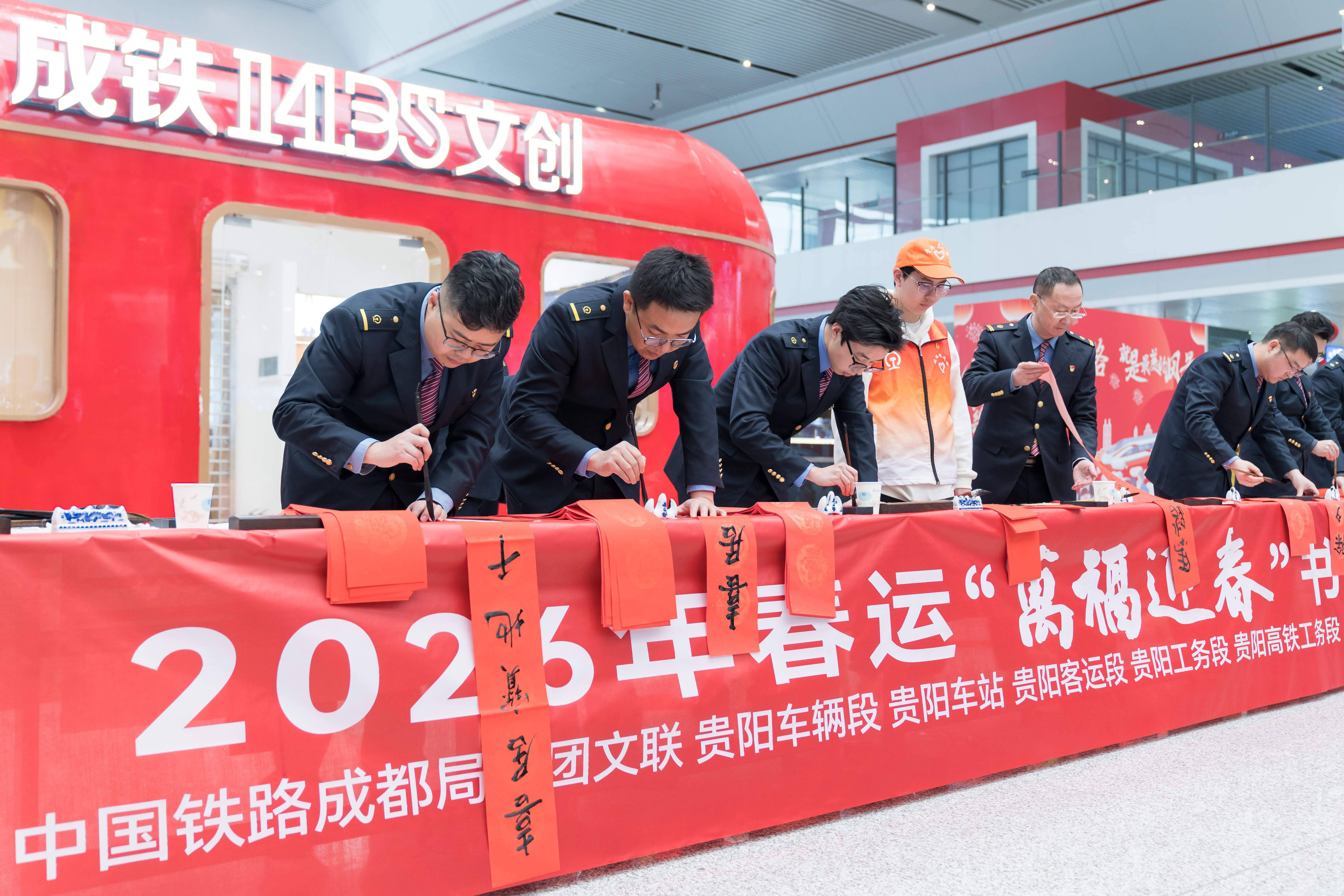 2月2日,春运大幕正式拉开,贵阳北站候车厅内人头攒动却秩序井然。中国铁路成都局集团有限公司文联书法分会组织的“万福迎春”书法公益活动在此温情启幕,10位来自贵阳车辆段、贵阳客运段等单位的书法爱好者在贵阳北站挥毫泼墨,用红彤彤的春联与“福”字,为南来北往的旅客送上新春祝福,让“平安春运、有序春运、温馨春运,让旅客体验更美好”的目标在墨香中落地生根。