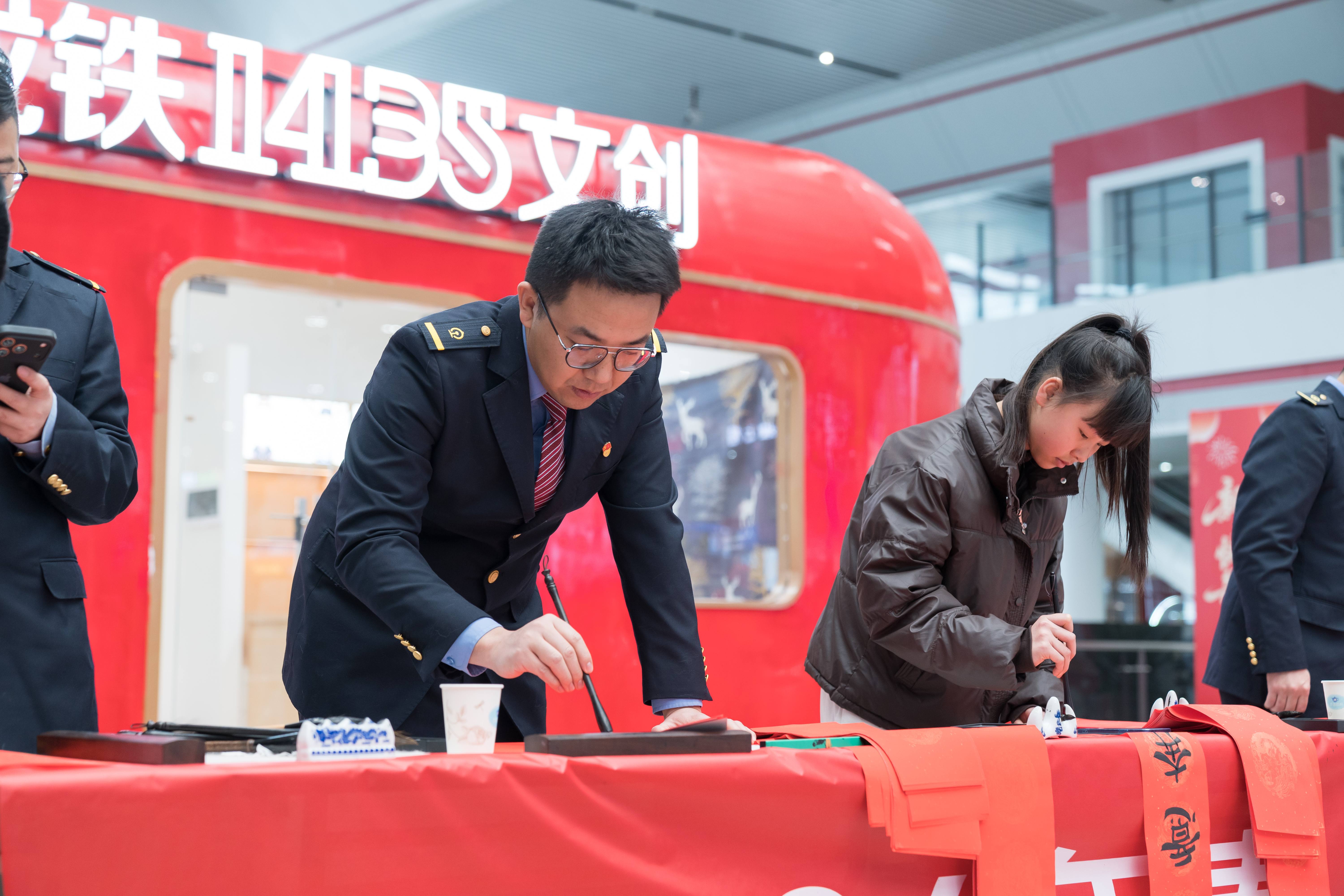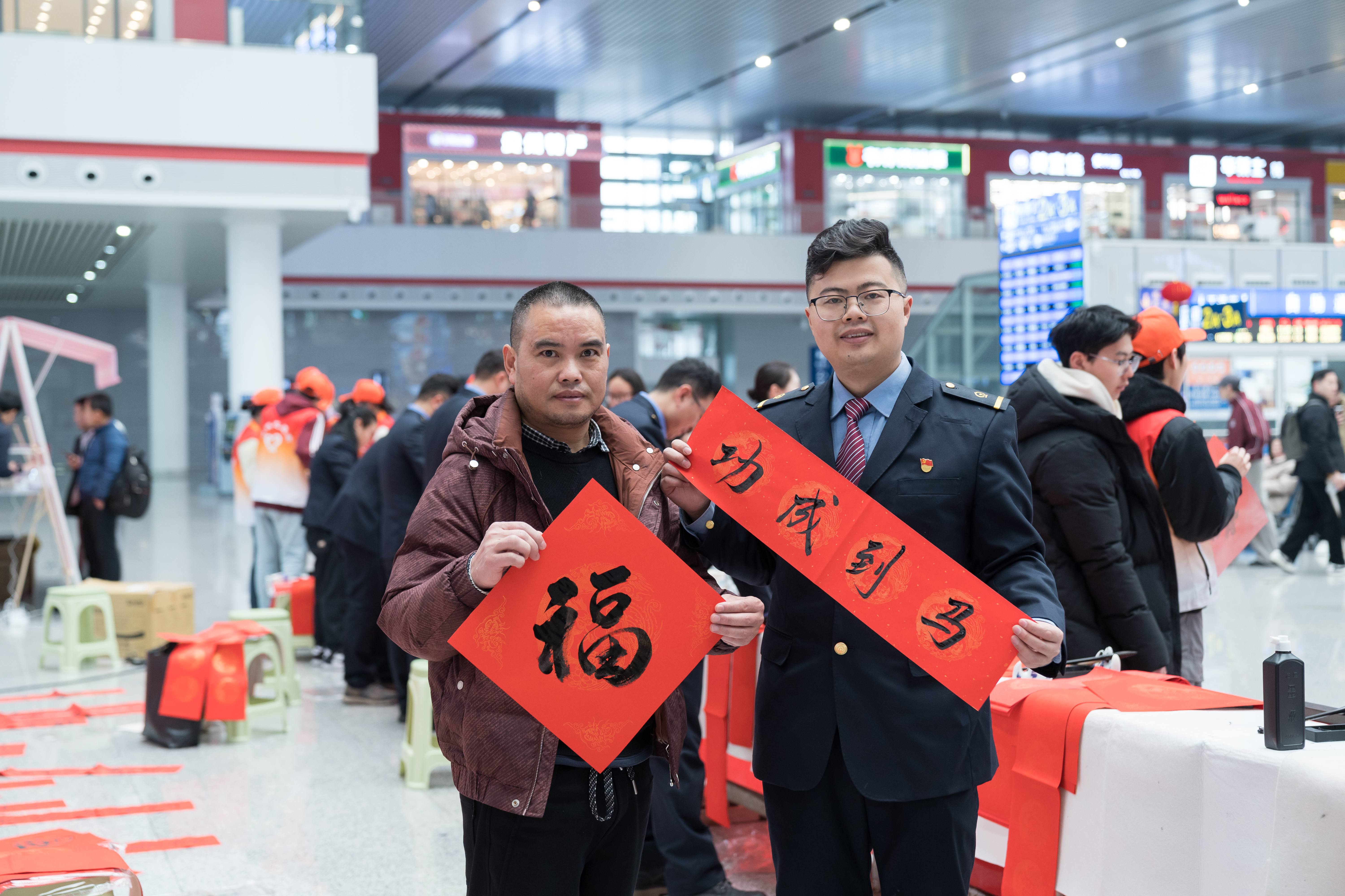 回家的节拍丨春运首日墨香暖归途,贵阳北站“万福迎春”送祝福
