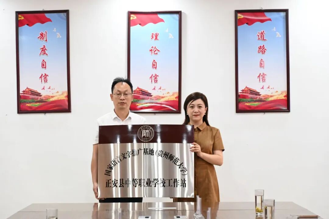 9月18日下午,国家语言文字推广基地(贵州师范大学)在正安县中等职业学校举行工作站授牌仪式。正安县委宣传部副部长吕坤、正安县中等职业学校党总支书记丁毅、国家语言文字推广基地(贵州师范大学)办公室副主任杨昌跃等出席授牌仪式。授牌仪式上,贵州师范大学传媒学院播音与主持艺术系副教授(播音指导)申炜为正安县中等职业学校授予工作站铭牌,传媒学院实验实训中心主任侯砚卿向该校赠送《中华经典资源库》数据硬盘。双方共同表示,希望通过以建立工作站为契机,加强交流与务实合作,充分发挥传媒学院在教师普通话培训、语言文字研究、影像制作与传播、国家通用语言文字推广普及等方面的优势,帮助学校不断加强县级普通话测试站的建设和测评员的队伍建设,助力学校培养更多“懂技能、会表达、有素养”的职业技术专业人才。