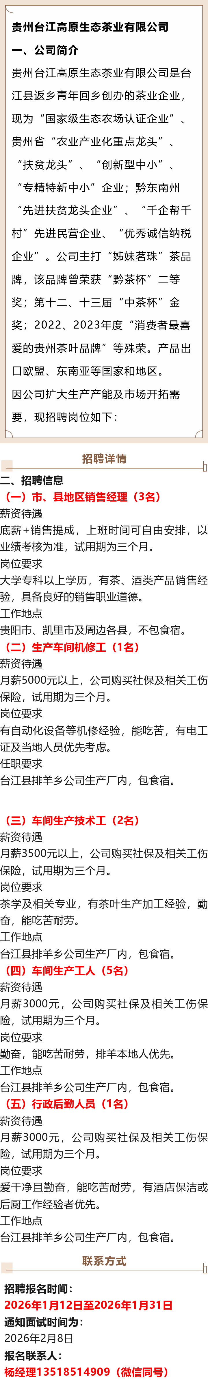 贵州台江高原生态茶业有限公司招聘!报名截止时间:2026年1月31日!