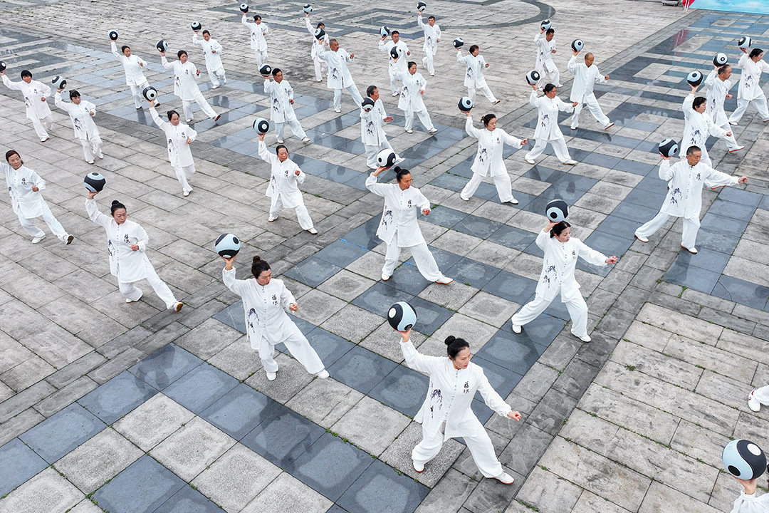 早上9点,在三丰主题文化馆广场,百余名太极拳爱好者齐聚一堂,各类太极特色展演节目轮番亮相、精彩纷呈。展演现场,既有刚柔并济的传统太极拳套路,行云流水的太极剑表演,也有飘逸洒脱的太乙拂尘展示,尽显中华传统武术风韵。活动中,新晋纳入全国武术正式竞赛项目的28式太极球也在展演之列,表演者以球为载体,将太极功法与球技巧妙融合,动作连贯协调,令人耳目一新。