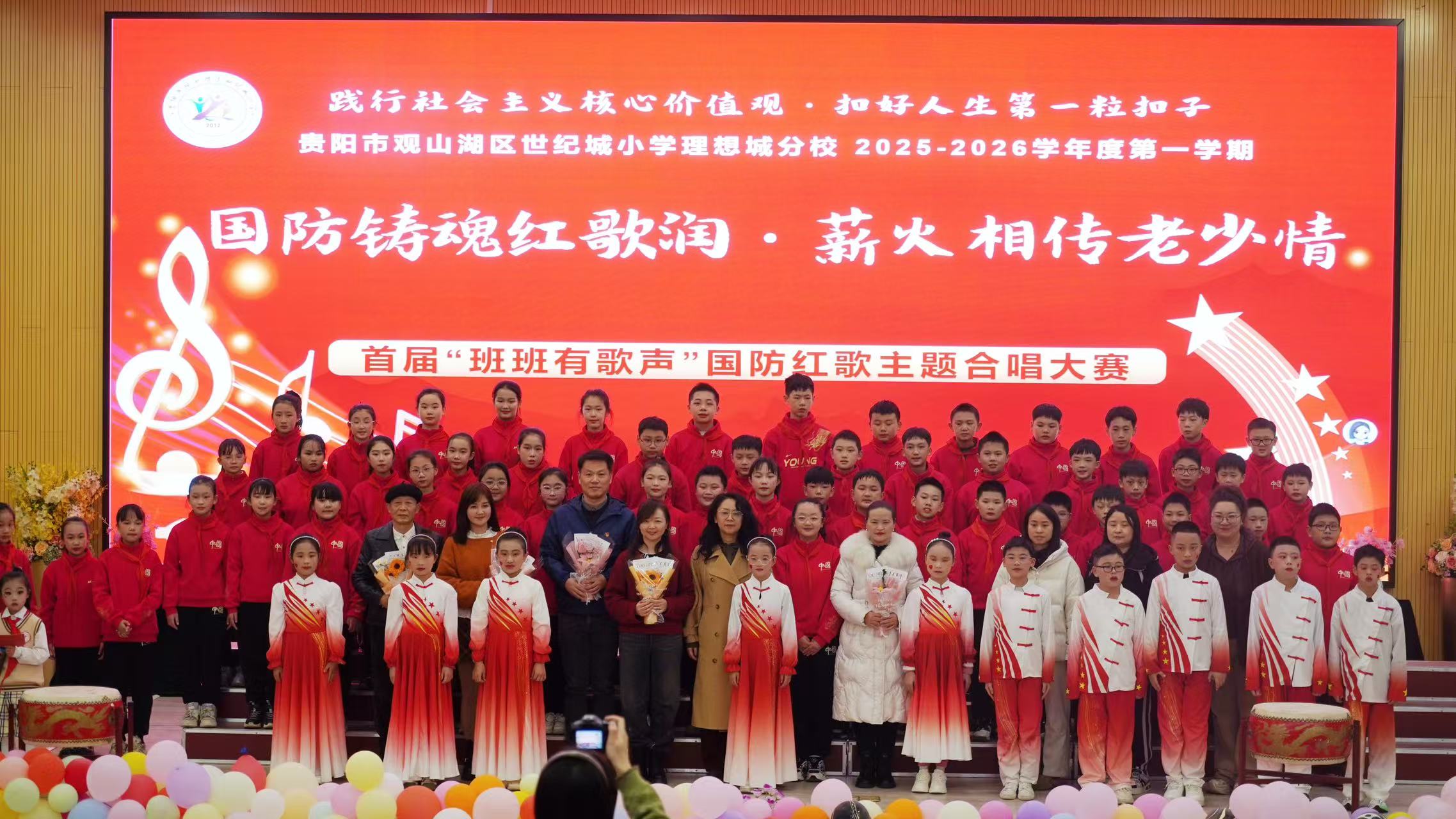 为厚植师生爱国情怀,强化国防观念,营造积极向上的校园文化氛围,12月9日,贵阳市观山湖区世纪城小学(理想城分校)举办以 “国防铸魂红歌润・薪火相传老少情”为主题的首届“班班有歌声”合唱大赛。学校一至六年级全体师生参与此次活动,共同唱响红色旋律,传承爱国精神。