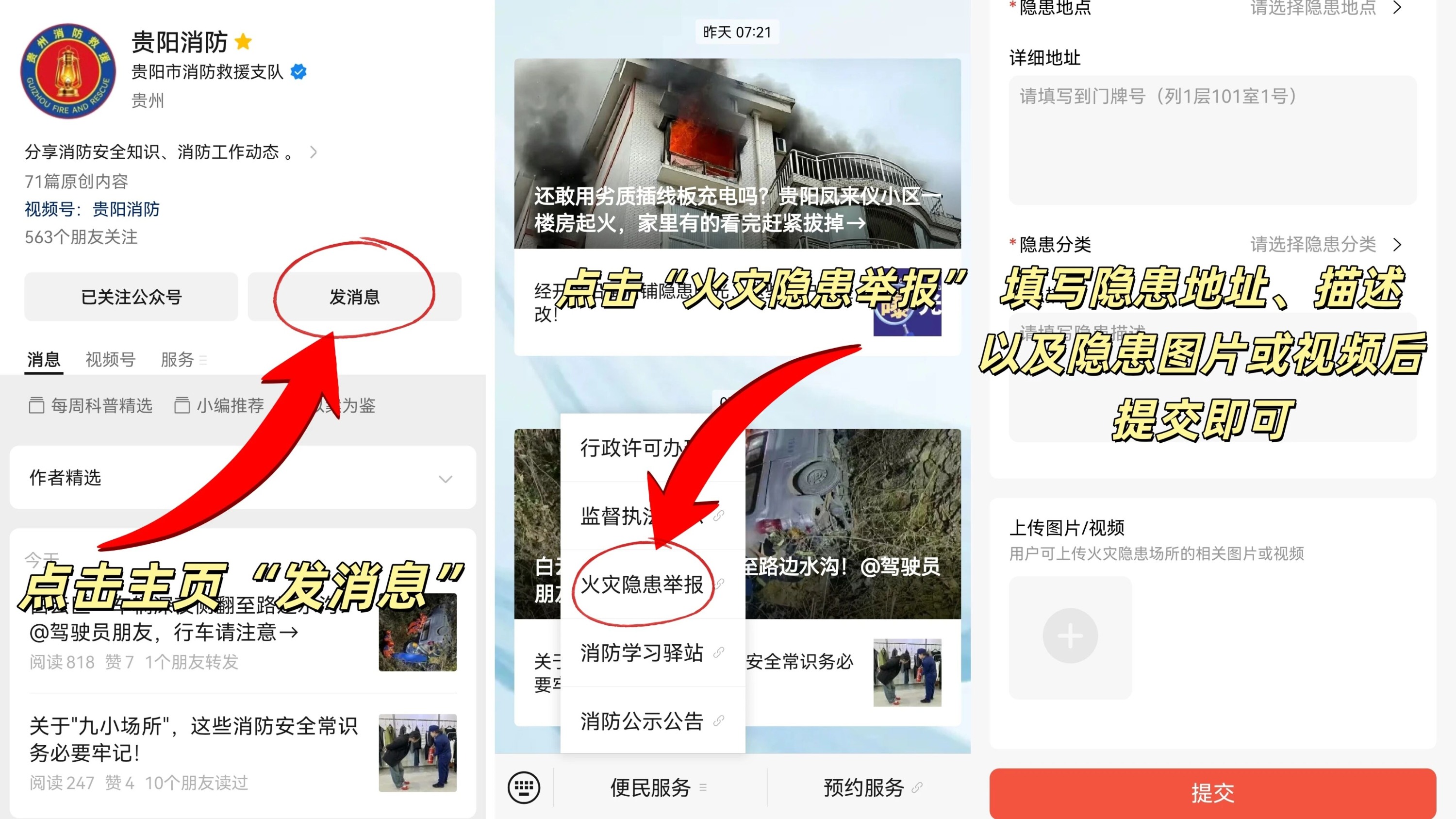 (“贵阳消防”微信公众号火灾隐患举报方式流程示意图)