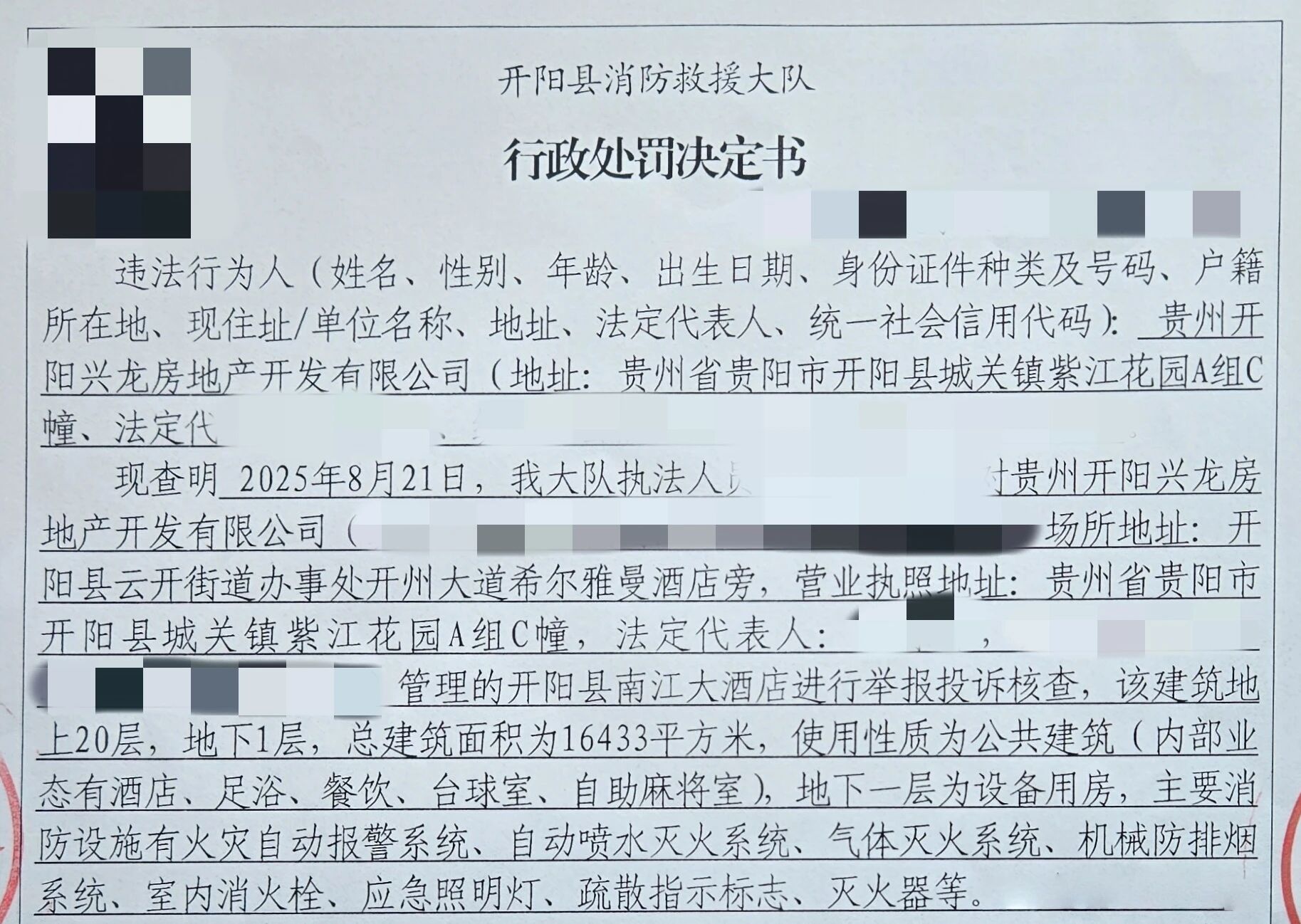 2025年8月21日,贵阳市消防救援支队开阳大队防火监督员在对贵州开阳兴龙房地产开发有限公司管理的开阳县南江大酒店进行举报投诉核查时发现以下11处消防安全隐患与违法行为,涉事公司因消防设施问题被罚5万元,又因消防控制室值班违规再罚1万元,合计6万元罚款,这一案例给全市场所敲响消防安全警钟。