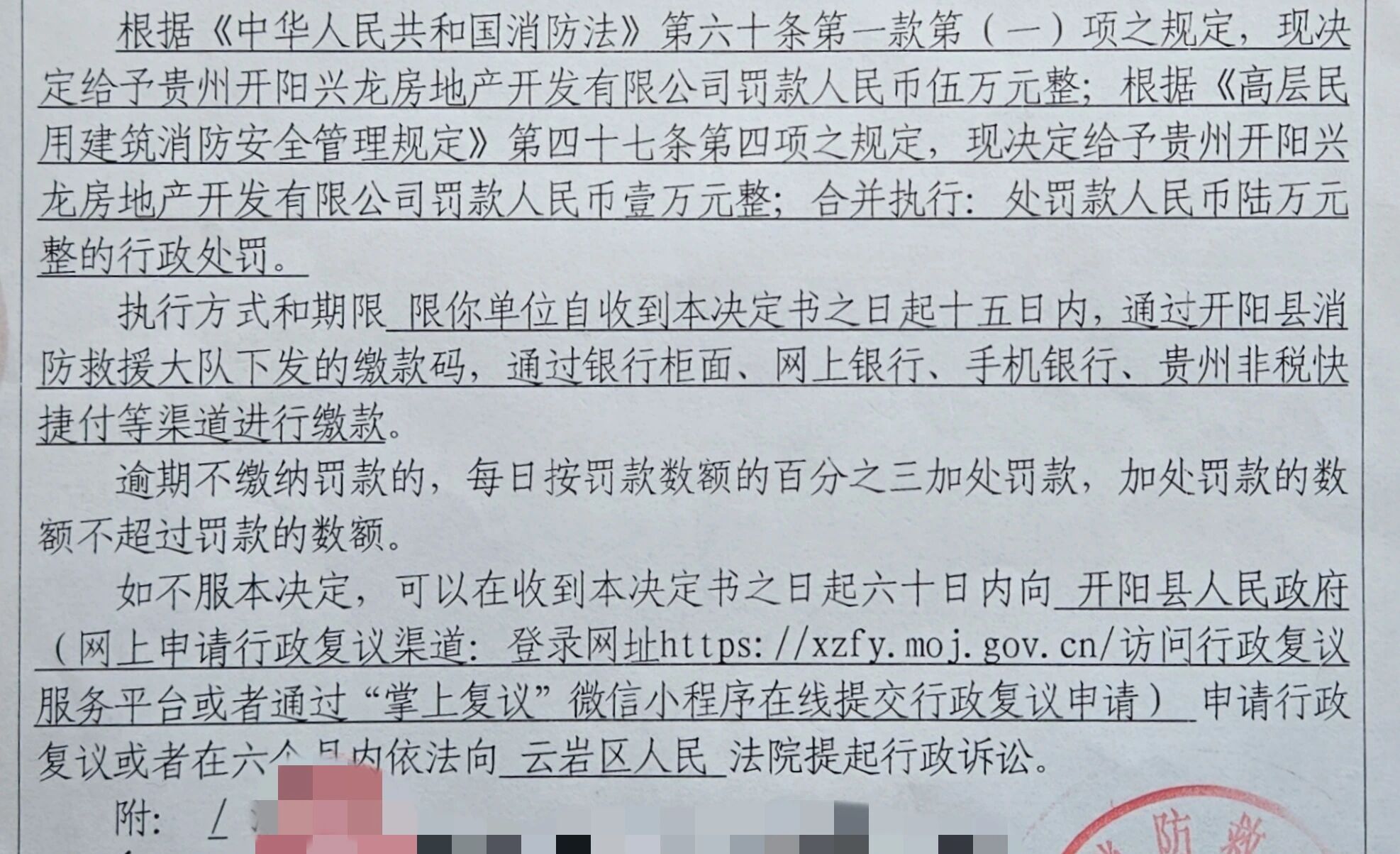 根据《中华人民共和国消防法》第六十条第一款第(一)项之规定现决定,给予贵州开阳兴龙房地产开发有限公司罚款人民币伍万元整。根据《高层民用建筑消防安全管理规定》第四十七条第四项之规定,给予贵州开阳兴龙房地产开发有限公司罚款人民币壹万元整,合并执行处罚款人民币陆万元整。