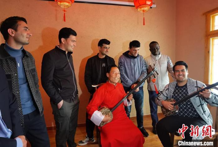 图为5月9日,外籍游客体验三弦伴奏的“凉州贤孝”。 戴文昌 摄