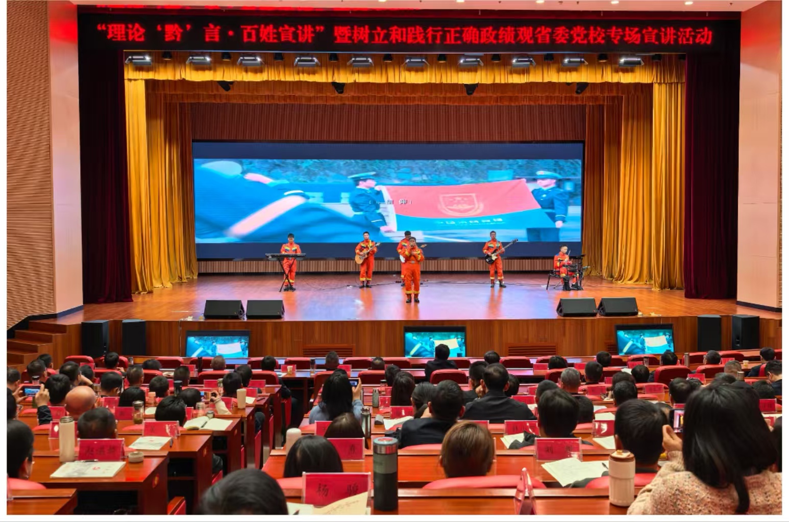 宣讲内容紧扣主题,案例鲜活。省生态环境厅宣讲员以《如果政绩观有颜色》讲述守护绿水青山的坚守;贵阳市花溪区发改局干部通过《创造人民满意的实绩政绩》展现一线为民解忧的担当;中国航发红林的宣讲员诠释了《以高质量发展成色检验政绩观底色》的深刻内涵;省残联工作者用《笑容里的政绩》分享了扶残助残的暖心答卷。省委网信办干部讲述了数字赋能乡村振兴的新实践,省女子强制隔离戒毒所民警深刻阐述了“潜绩”与“显绩”的统一。观山湖区消防救援大队的宣讲员以抗洪救灾的真实故事,践行《为民造福是最大政绩》的誓言,随后大队“沧蓝乐队”的原创歌曲将现场气氛推向高潮。