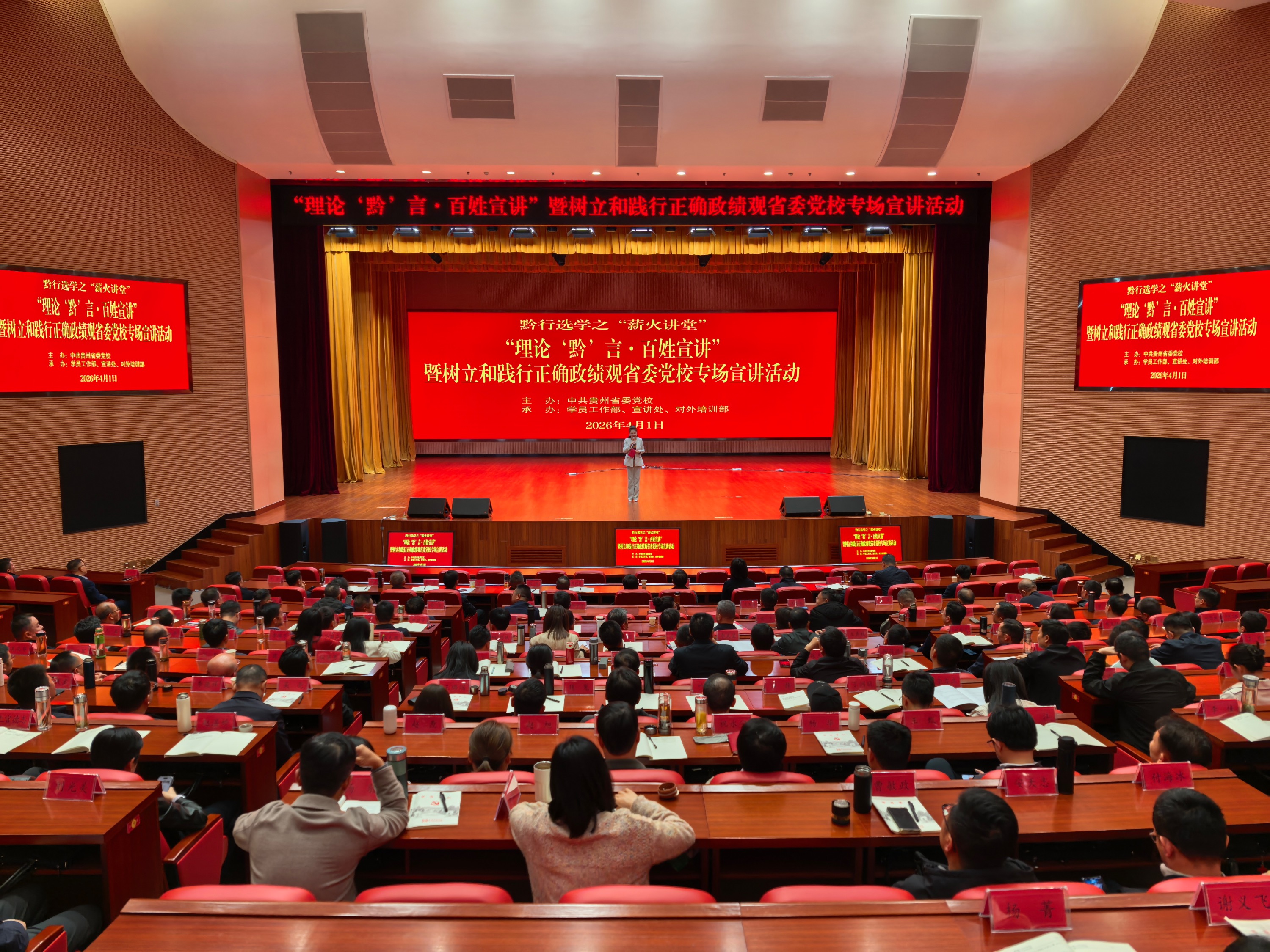 4月1日晚,“理论‘黔’言·百姓宣讲”暨树立和践行正确政绩观专场活动在贵州省委党校礼堂举行。来自省委党校厅干班、中青班等班次学员及相关培训班学员、教职工近300人现场聆听。