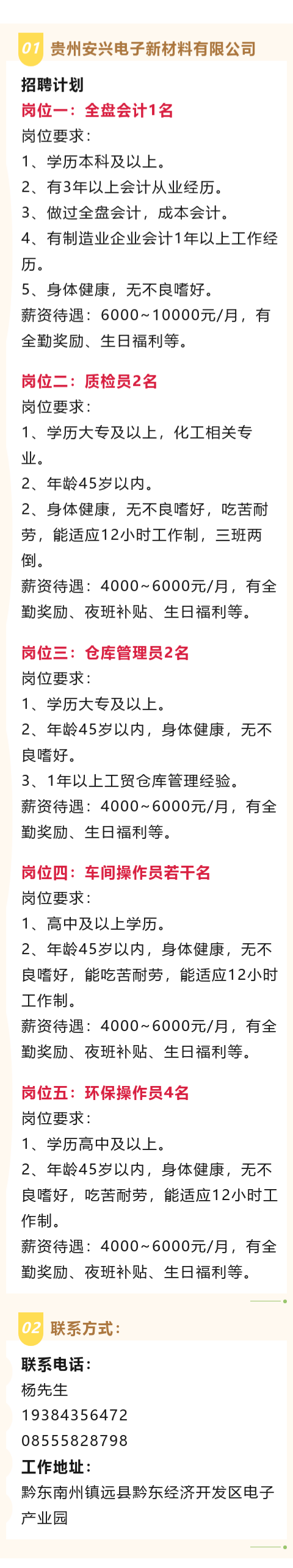 贵州安兴电子新材料有限公司5岗招聘!月薪4000-10000元!高中起报!