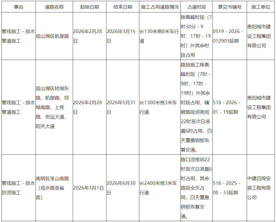 贵阳市观山湖区凯里路等近期临时占用道路施工提示