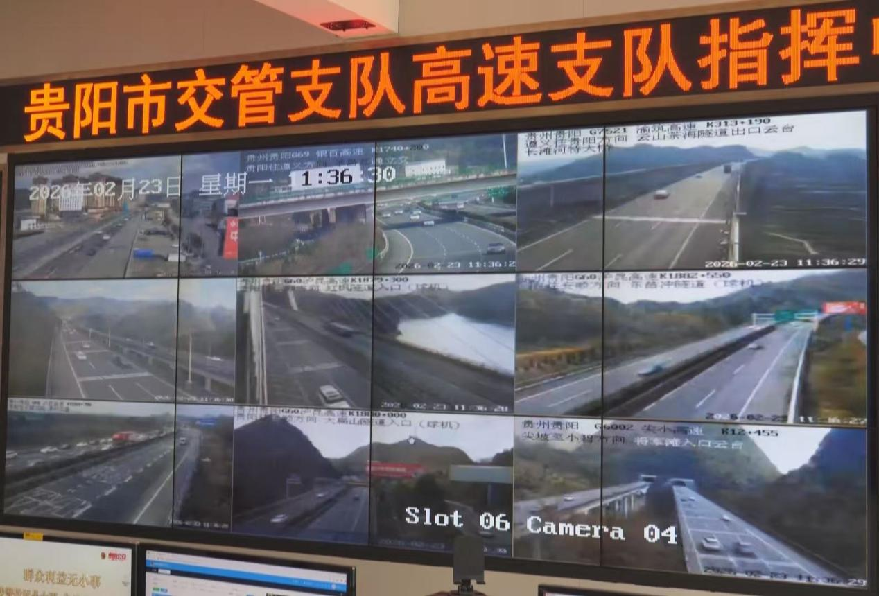 在贵阳市公安局交管支队高速支队指挥中心,值班民警正通过大数据平台与视频巡查,实时监控全市高速路网运行状态。据悉,自2月20日(大年初四)起,贵阳高速已进入返程大流量运行模式。