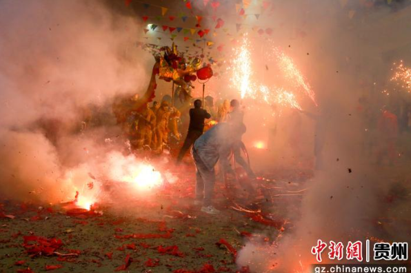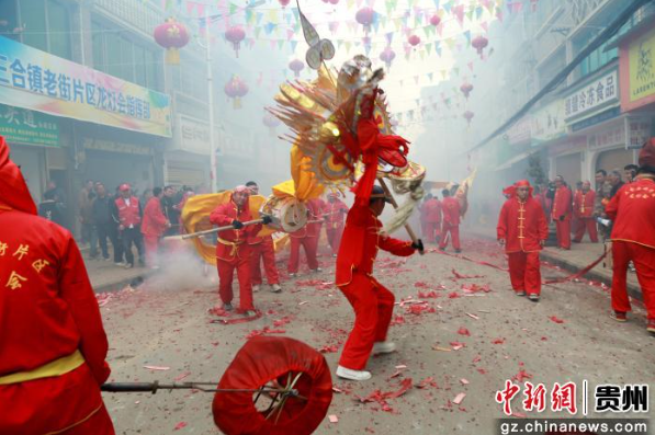 2月25日,舞龙人员在贵州省遵义市播州区三合镇集镇舞龙。李家燕 摄