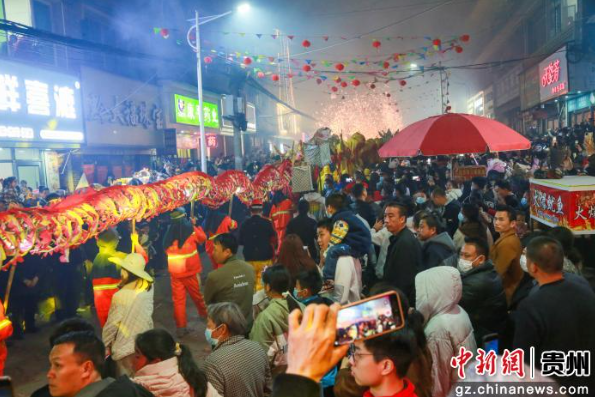 2月25日,市民群众与游客前往贵州省遵义市播州区三合镇观看舞龙闹新春民俗活动。李仁军 摄