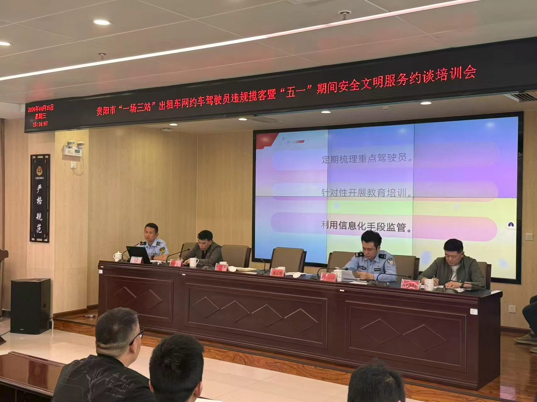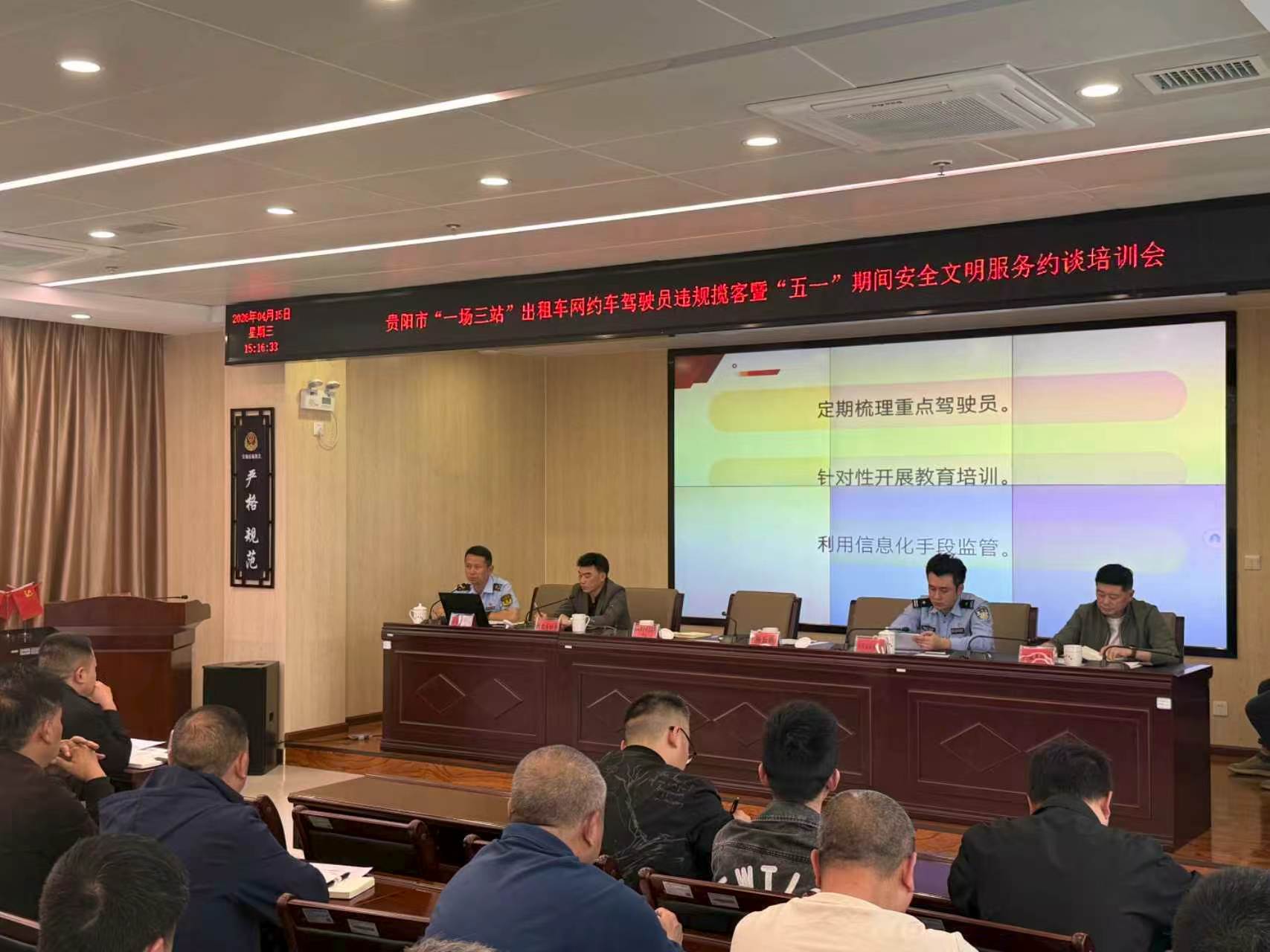 2026年4月15日,贵阳市交通运输综合行政执法支队、观山湖区高铁经济带服务中心、贵阳北站治安派出所联合对全市53家出租车网约车企业和45名涉嫌违规揽客驾驶员,开展“一场三站”违规揽客暨“五一”期间安全文明服务集中约谈培训,从企业源头开展违规行为治理工作。