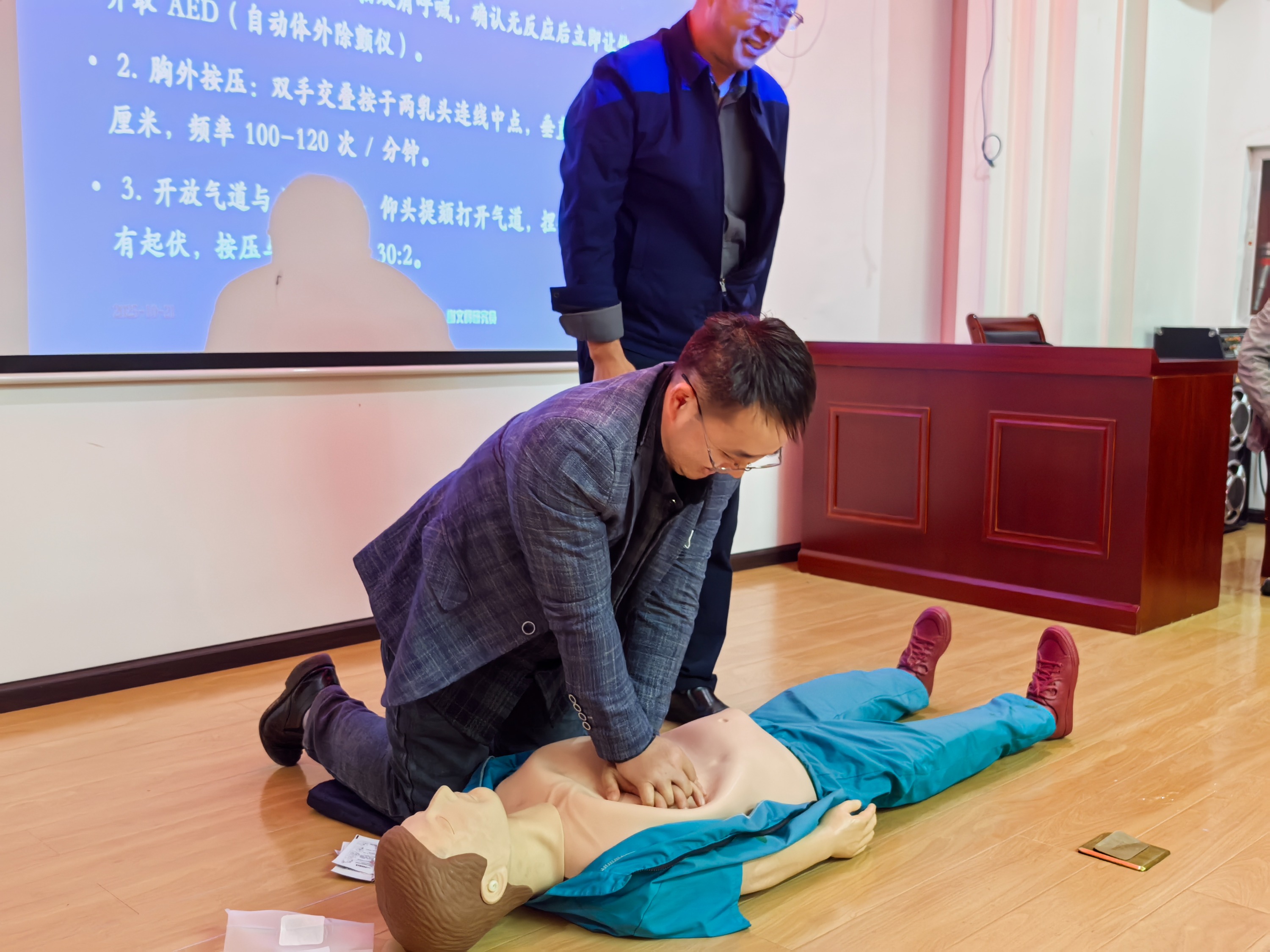 为进一步巩固学习成果、提升实操能力,培训现场还精心穿插知识问答与应急演练环节。知识问答环节,学员们踊跃举手抢答,在趣味互动中加深对工伤预防政策与安全知识的记忆;应急演练环节,专业人员现场示范心肺复苏标准操作流程、灭火器正确使用方法,逐一步骤讲解动作要领,并邀请学员上台“实战演练”,针对操作中的不规范之处进行一对一指导纠正,确保每一位参训人员都能熟练掌握应急处置技能,真正做到“学懂、弄通、会用”。