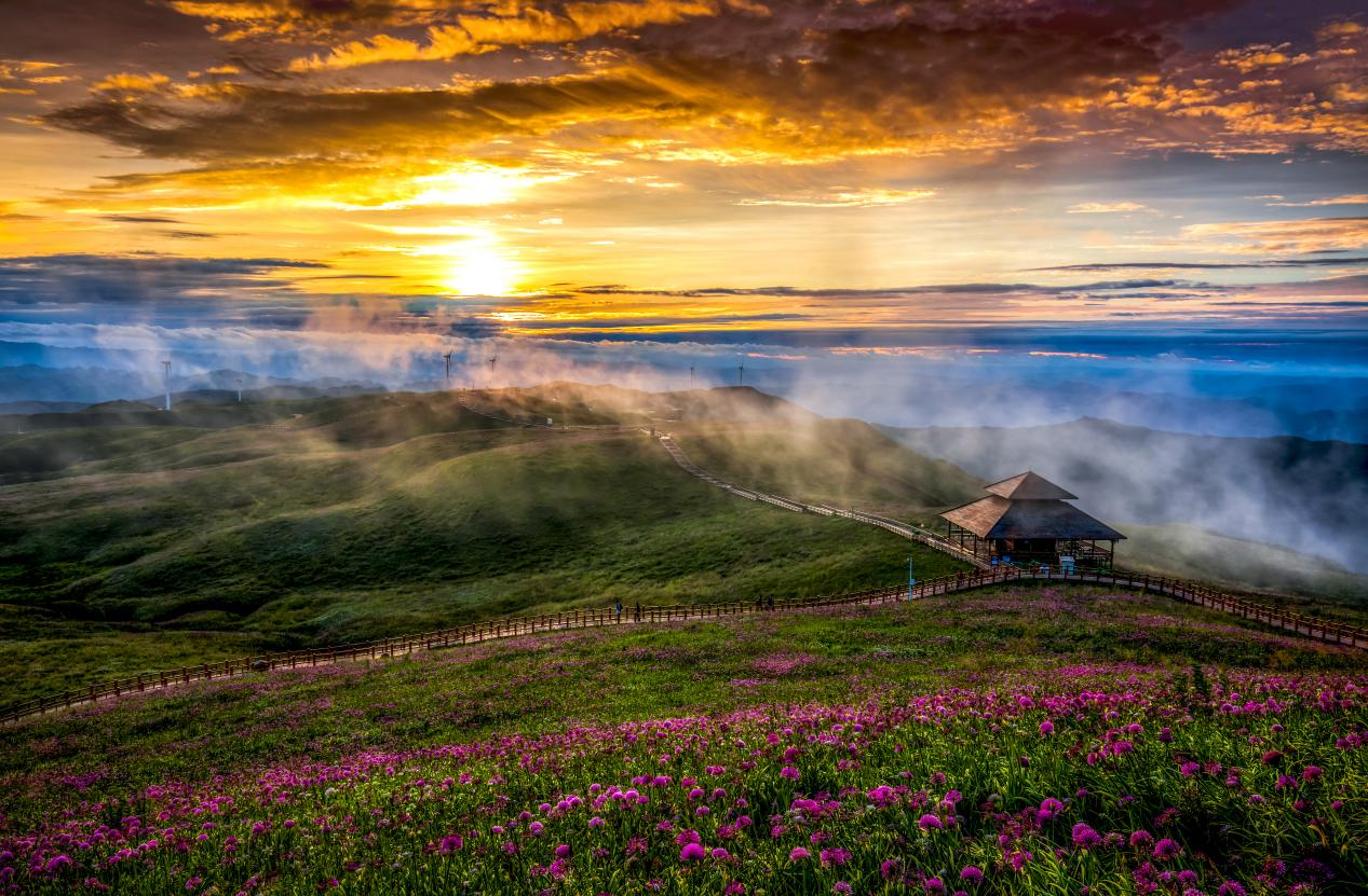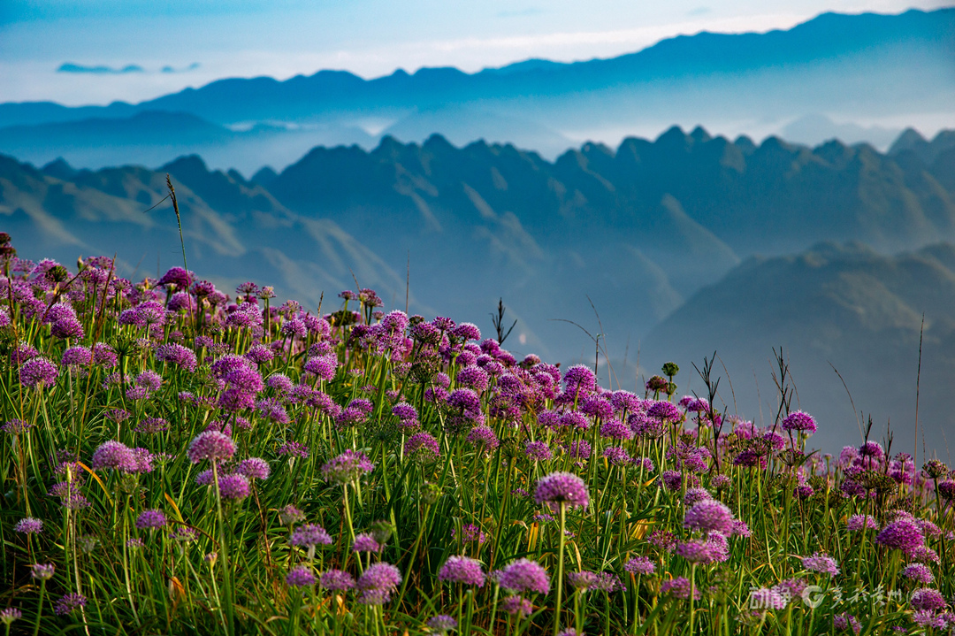 每年秋季,大韭菜坪漫山遍野的野生韭菜花竞相绽放,紫色的花海铺满山峦,与远处的风车、蓝天白云相映成趣;若是遇上日出云海、夕阳晚霞,更如临仙境。