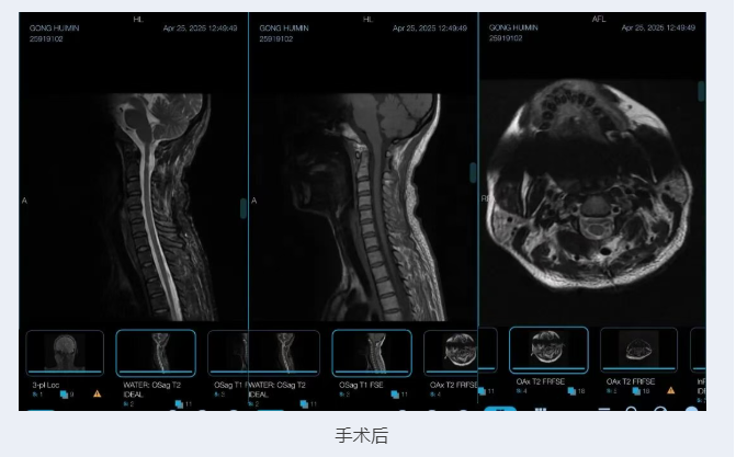 龚女士恢复迅速,颈肩痛和肢体无力症状很快消失。最让她感到庆幸的是,她的脖子和生病前一样灵活自如。