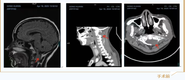 近半年来,45岁的龚女士颈肩持续胀痛,且不适感逐渐加剧,近期左手变得无力,紧急到贵阳市第一人民医院就医。检查结果令人震惊:一颗肿瘤,长在了颈椎最顶端、最要害的“生命禁区”——寰枢椎位置。
