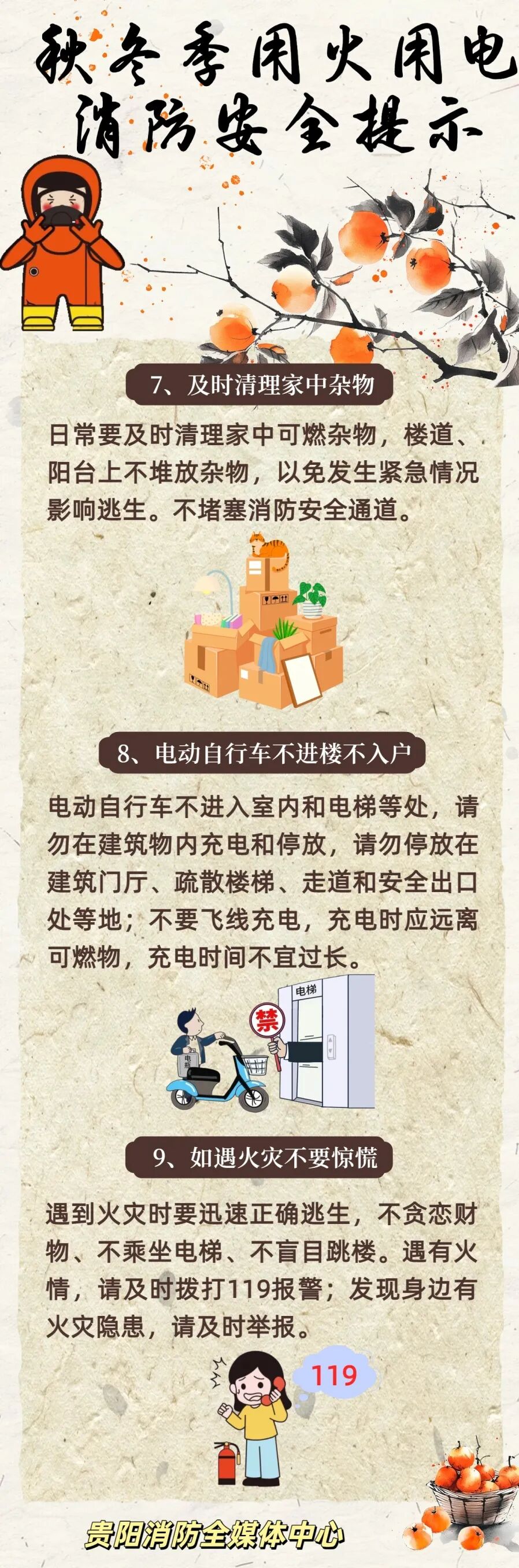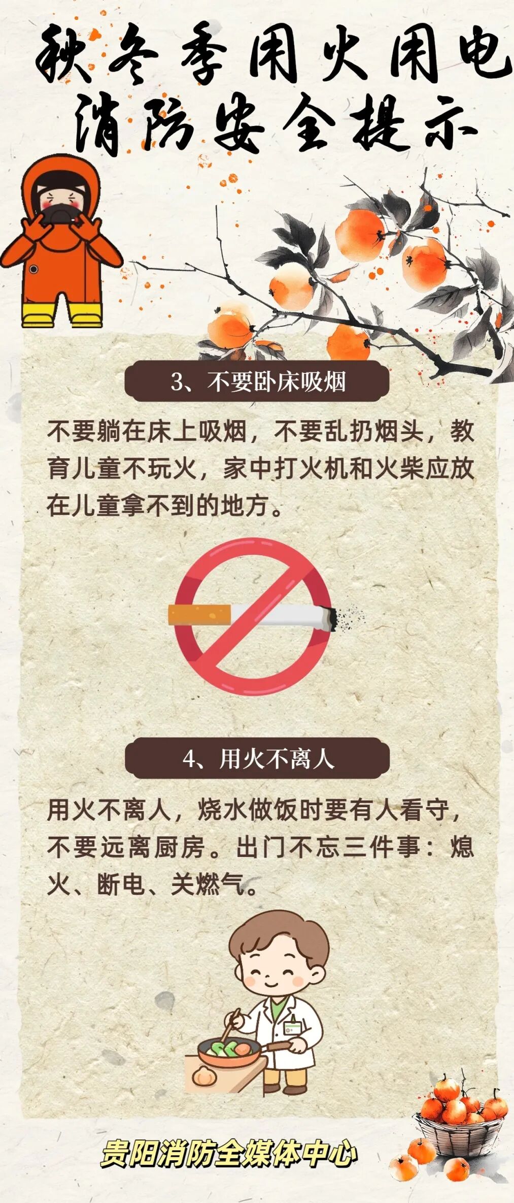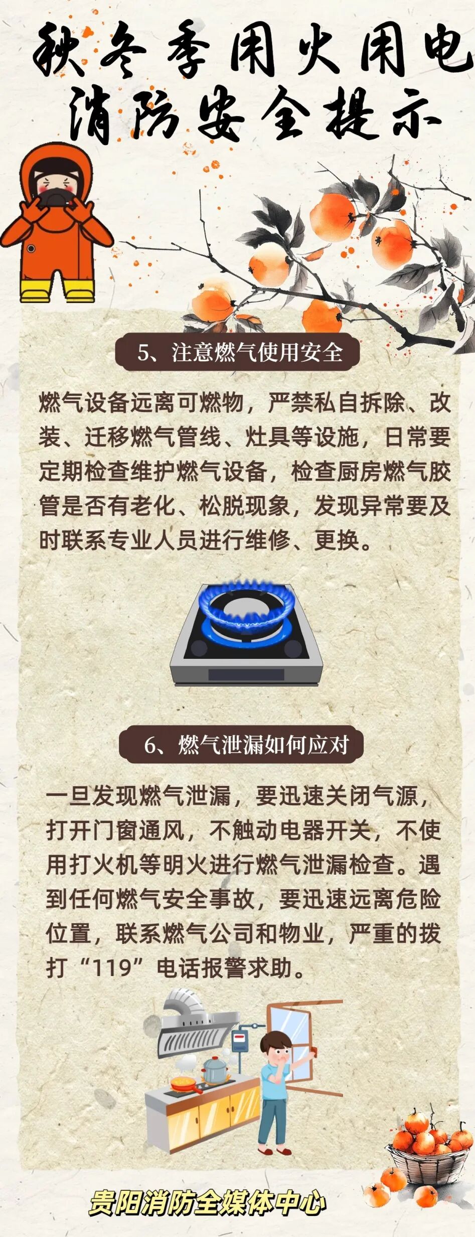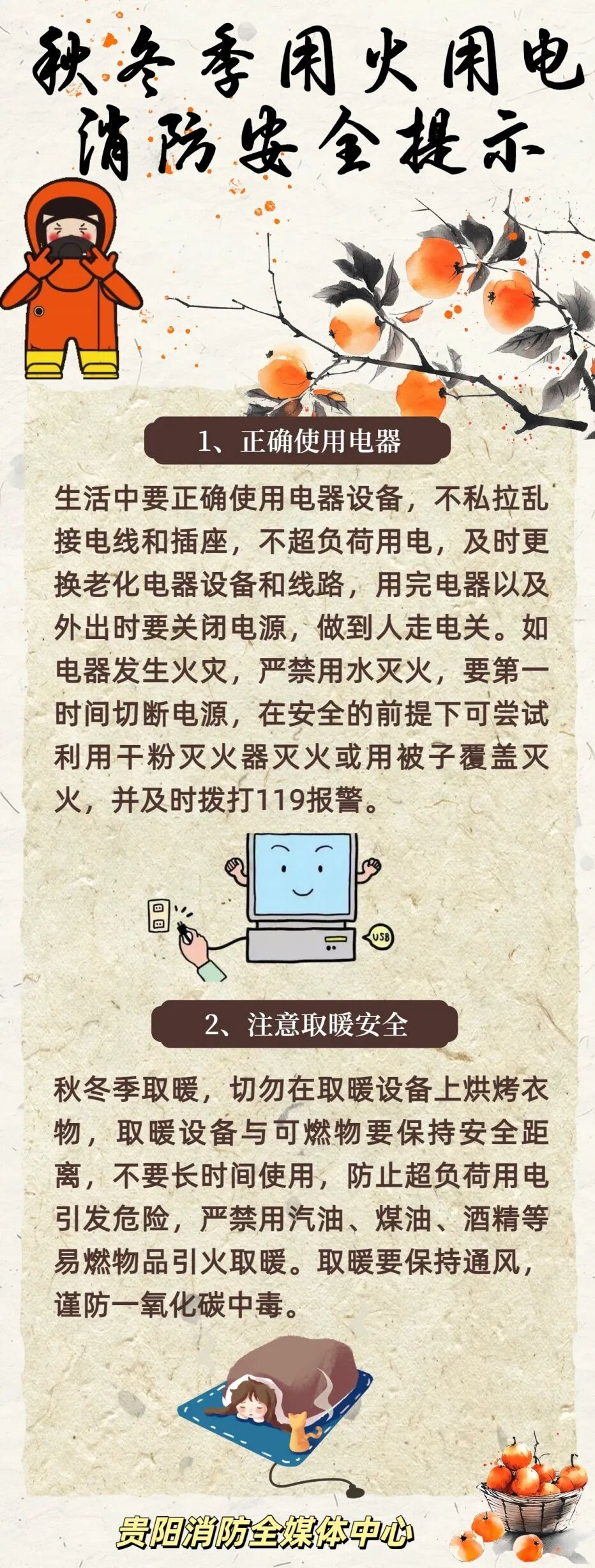 用火用电消防安全关系着我们每一个人的生命财产。贵阳市消防救援支队提醒大家,转眼间已来到秋冬季,气温逐渐下降,无论是家庭还是餐饮场所,在生活日常中,一定要注意用火用电,切记厨房用火不离人,外出记得三清三关,要规范使用电器,不可使用劣质插线板取暖,设备记得远离可燃物。